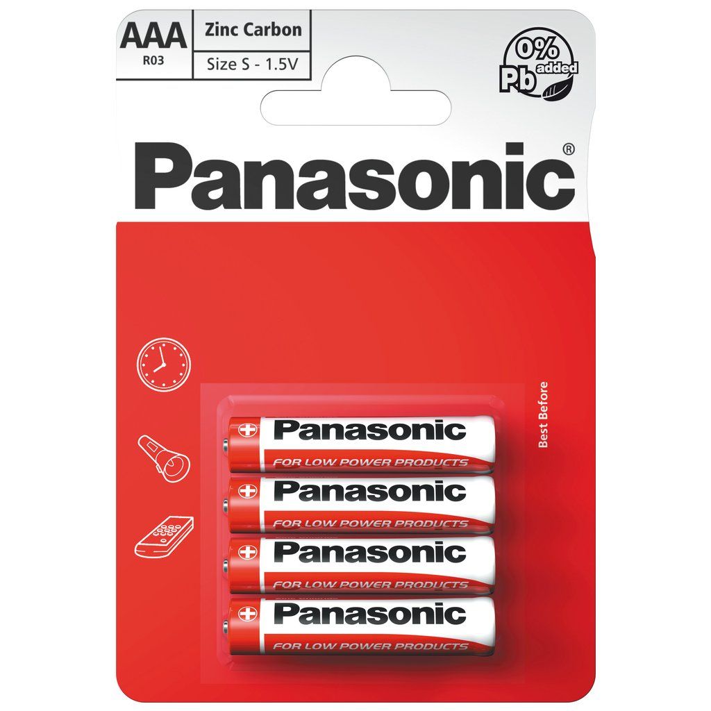 Zinkouhlíkové baterie Panasonic poskytují finančně výhodný zdroj energie pro zařízení s nízkou energetickou náročností. Jednoduchá a spolehlivá technologie. Vynikající poměr kvalita/cena. Finančně výhodná vzhledem k nákladům na hodinu provozu zařízení s nízkou energetickou náročností. Celistvá a přehledná produktová řada.