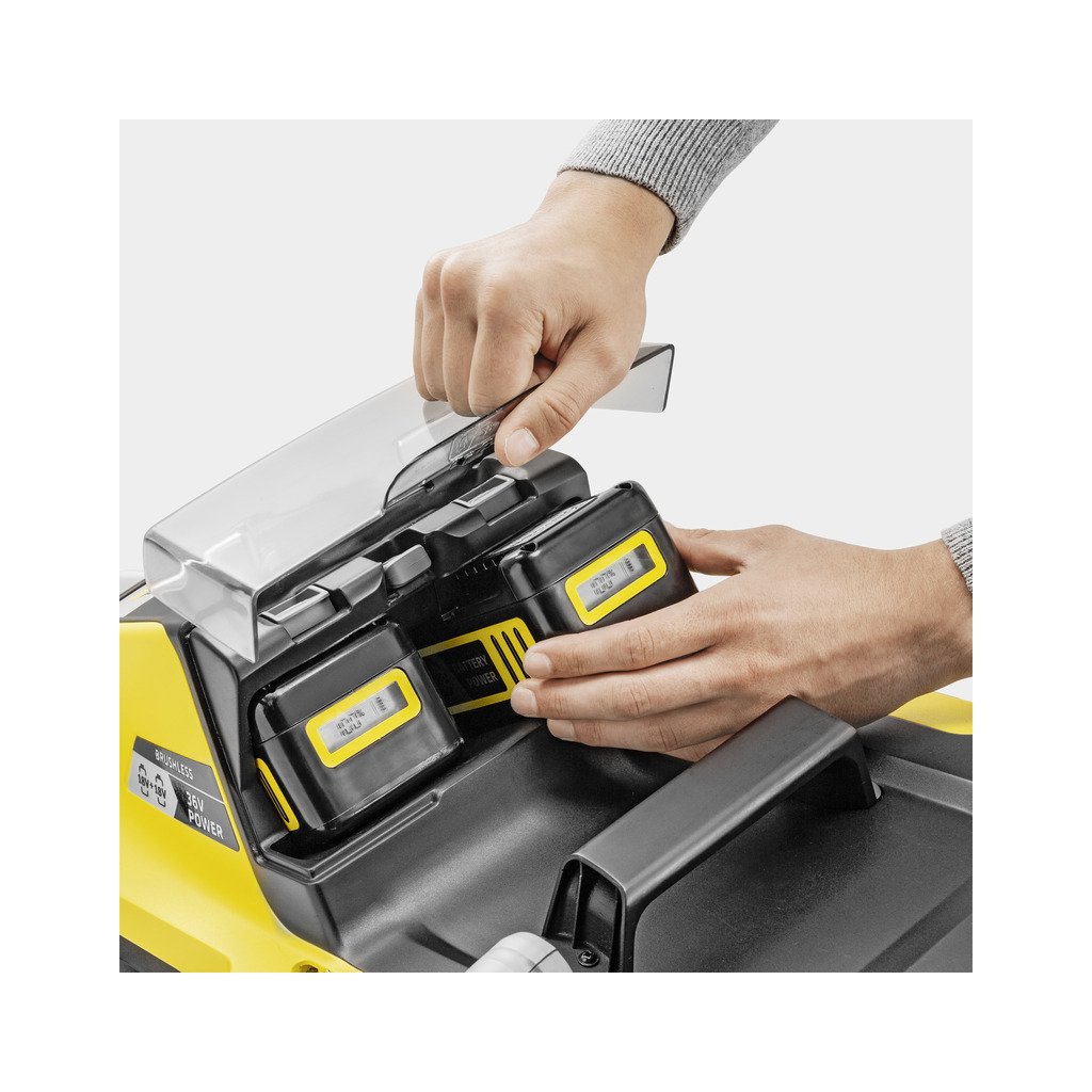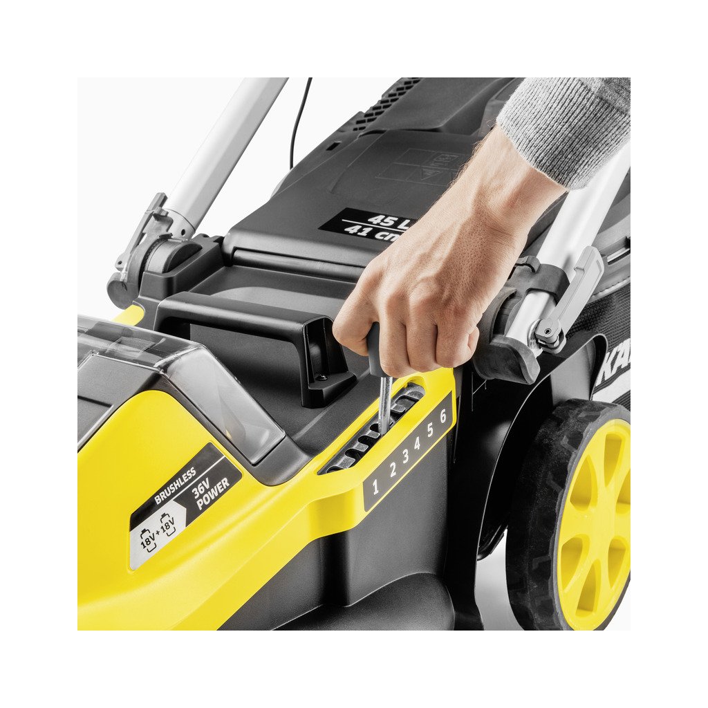 Se dvěma 18voltovými bateriemi a výkonným bezuhlíkovým 36voltovým motorem si sekačka LMO 5-18 Dual Battery poradí i s velkými trávníky o rozloze až 550 m2. Lehká a obratná akumulátorová sekačka se bez námahy pohybuje po nerovném terénu a kolem překážek. Pracovní záběr je 41 cm a výšku sečení lze nastavit do jedné ze šesti úrovní v rozmezí od 25 do 70 mm. Při sečení inteligentní systém řízení motoru iPower automaticky přizpůsobuje rychlost otáček podmínkám trávníku. Podél okrajů trávníku narovnávají hřebeny stébla trávy a zajišťují, že žádné stéblo nevynecháte. Systém sečení 2 v 1 umožňuje rovnoměrné rozprostření posekané trávy po trávníku jako přírodního hnojiva při mulčování nebo sběr do velkého 45litrového sběrného koše - pro delší sečení bez přestávky. Vodicí rukojeť je teleskopická pro pohodlnou a ergonomickou pracovní polohu. Skládací rám zabírá při skladování velmi málo místa. K dispozici je velké, robustní držadlo pro přenášení do schodů a přes schody. Sekačka LMO 5-18 Dual Battery je kompatibilní s 18V bateriovou platformou Kärcher Battery Power. Baterie a nebíječka nejsou součástí balení.