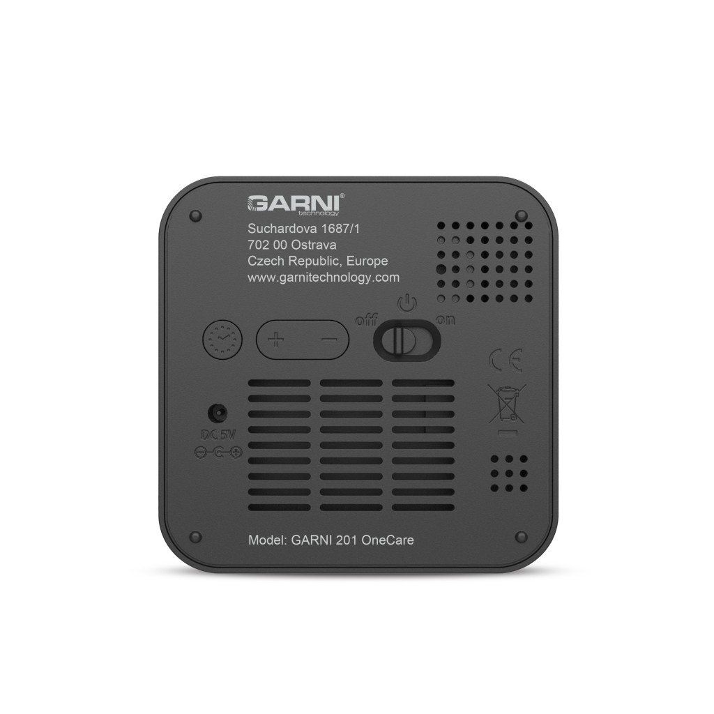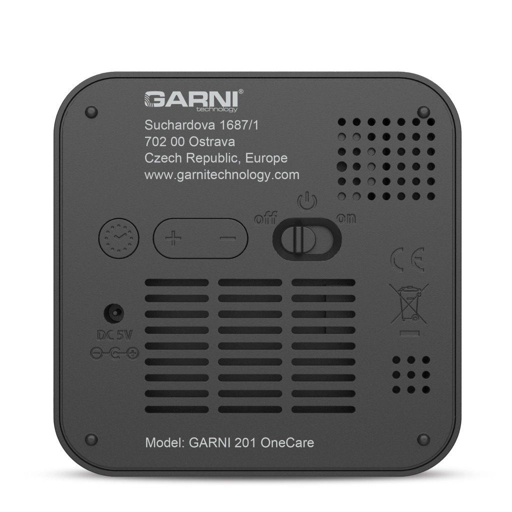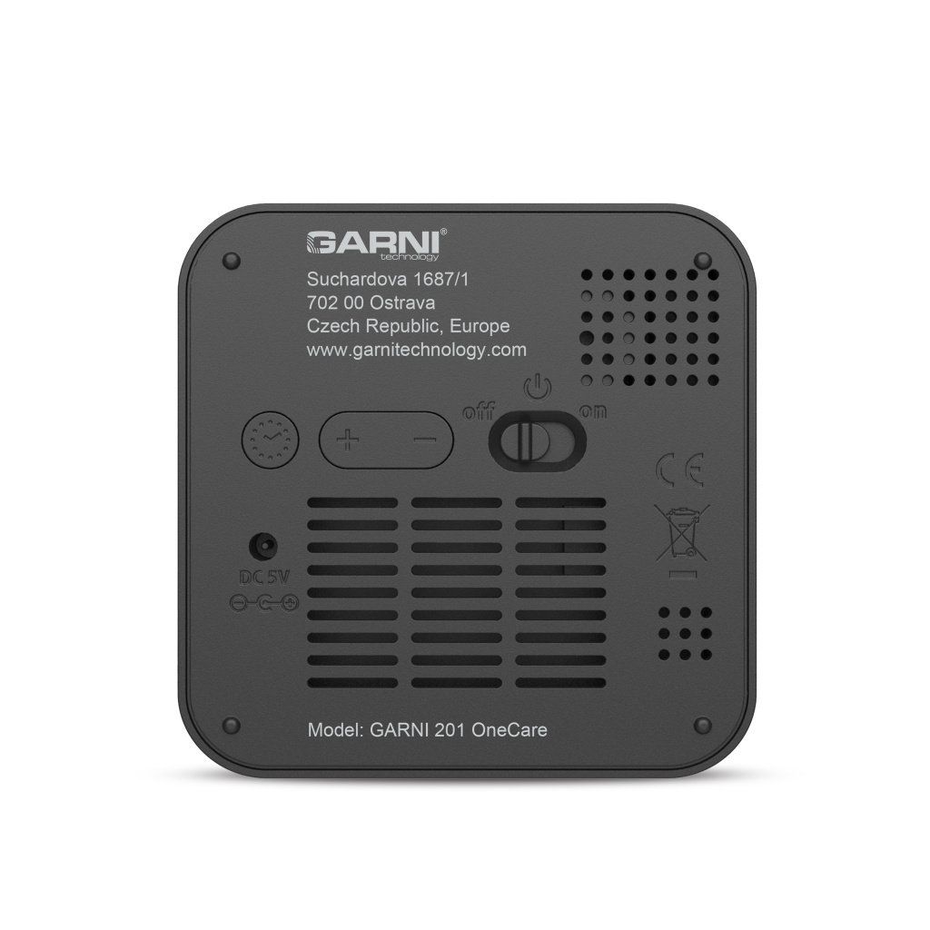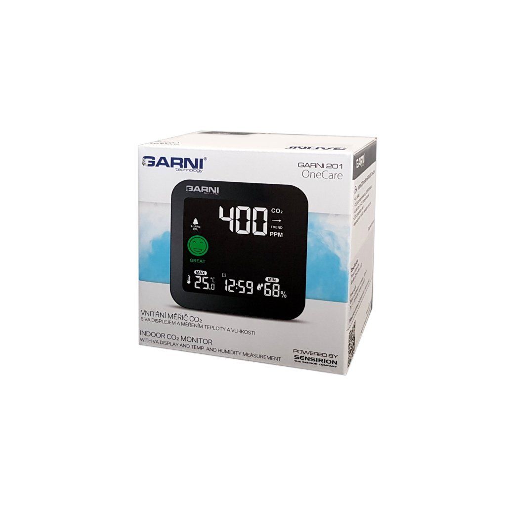 Měřič CO2 (kysličníku uhličitého) GARNI 201 OneCare je určen pro vnitřní použití. Měří a zobrazuje na svém barevném inverzním VA displeji hodnoty CO2 ve vzduchu také teplotu a relativní vlhkost. Pro měření CO2, teploty a relativní vlhkosti je použito fotoakustické čidlo SENSIRION řady SCD4x