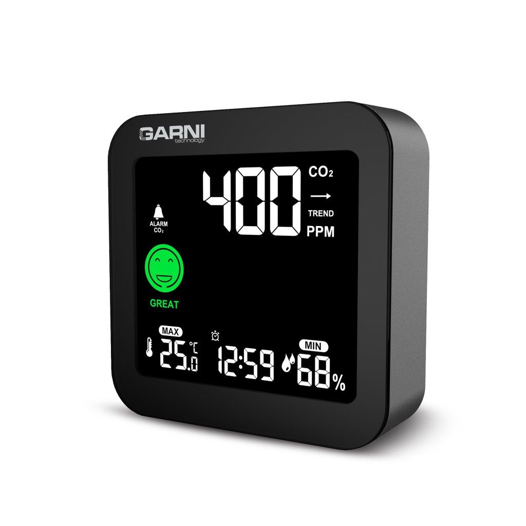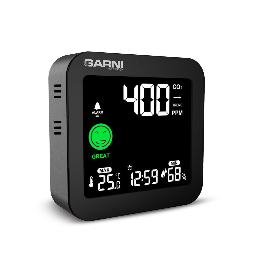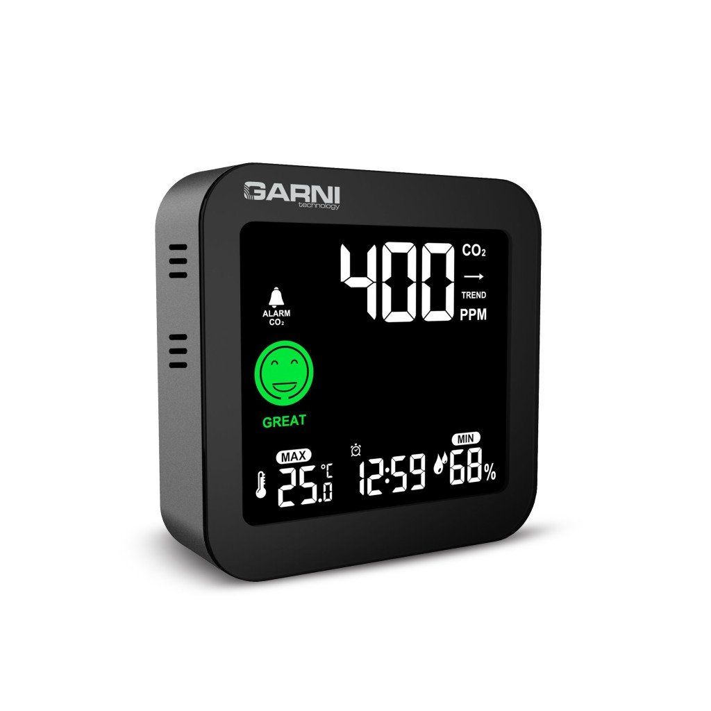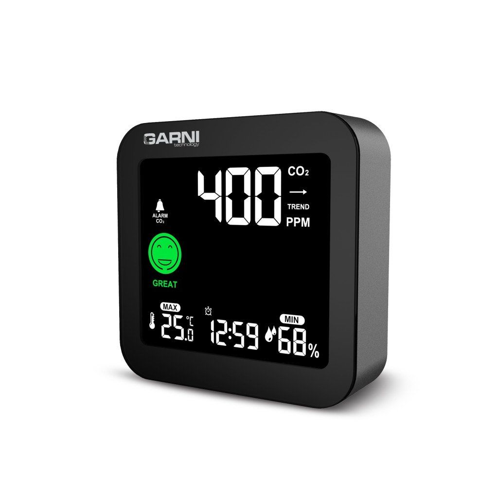 Měřič CO2 (kysličníku uhličitého) GARNI 201 OneCare je určen pro vnitřní použití. Měří a zobrazuje na svém barevném inverzním VA displeji hodnoty CO2 ve vzduchu také teplotu a relativní vlhkost. Pro měření CO2, teploty a relativní vlhkosti je použito fotoakustické čidlo SENSIRION řady SCD4x