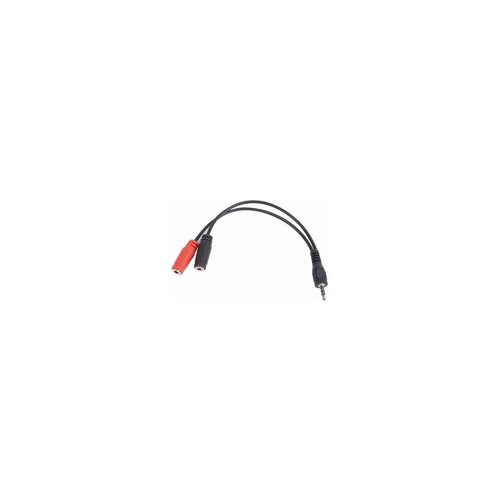 Kabelová rozdvojka jack 3,5mm (4 pólový) na 2x3,5mm M/F, 20cm, audio. Umožňuje připojení běžných sluchátek do mobilní zařízení s 4pólovým jack výstupem (na jedno jack konektoru jsou vedena sluchátka i mikrofon)
