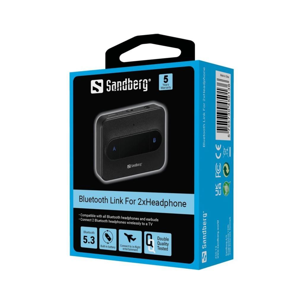 Pomocí propojení Sandberg Bluetooth Link můžete bezdrátově připojit 1 nebo 2 sluchátka ke zdroji zvuku, jako je televizor nebo počítač. Sandberg Bluetooth Link se jednoduše připojí k výstupu MiniJack pro sluchátka a poté bezdrátově odešle zvukový signál prostřednictvím Bluetooth. Propojení Sandberg Bluetooth Link je napájeno přímo prostřednictvím USB. Výdrž baterie až 6 hodin, pokud není připojeno USB. Lze připojit dvoje sluchátka stejného typu, aby dva lidé mohli sledovat stejný film s bezdrátovými sluchátky, aniž by rušili ostatní v okolí. Ideální pro dlouhé lety, do vlaku, do školy nebo do kanceláře.