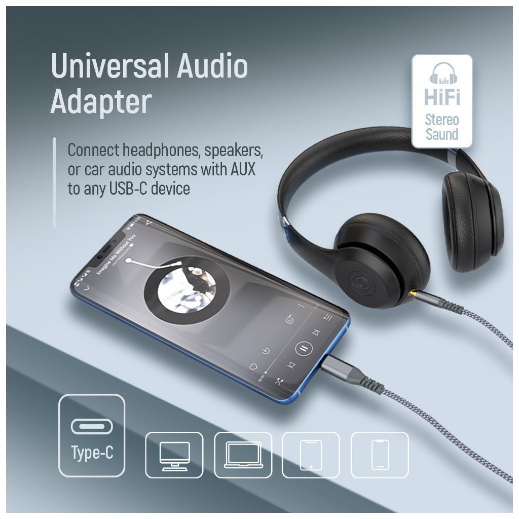 Adaptér umožňuje připojení sluchátek, autorádia, reproduktorů a dalších audio zařízení s 3,5mm AUX vstupem ke smartphonům, tabletům a dalším zařízením s USB-C portem.