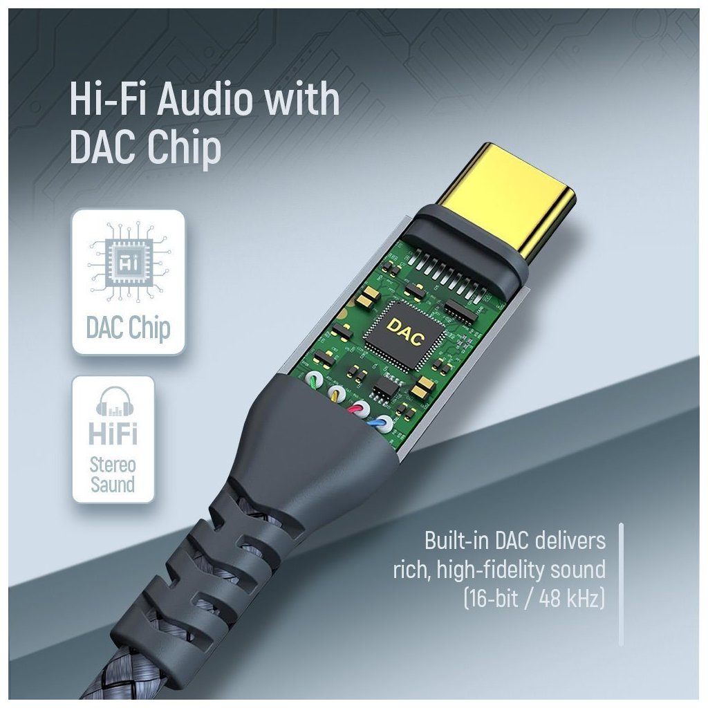 Díky integrovanému DAC chipu zajišťuje čistý a kvalitní stereo zvuk bez ztráty kvality.