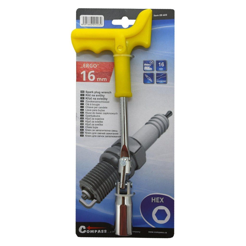 Kovový klíč (16 mm) určený k montáži nebo demontáži zapalovacích svíček automobilu. Kloubová redukce a speciální ergonomické zakončení klíče pro snazší manipulaci.
