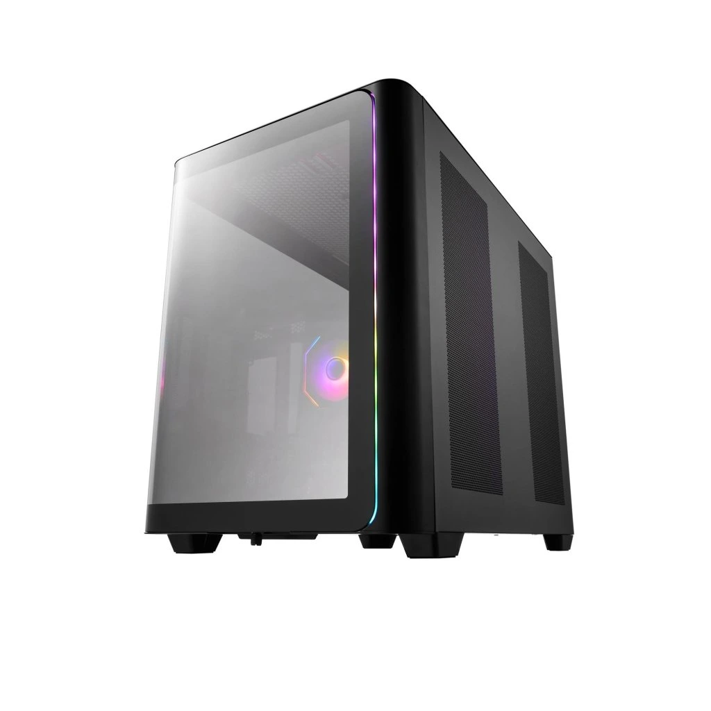 - Zakřivené tvrzené sklo: Poskytuje panoramatický výhled 270° na komponenty s efektním vizuálním dopadem.