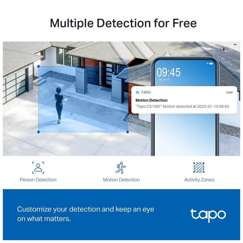 Kamerová jednotka Tapo C510W využívá umělou inteligenci pro pokročilou detekci pohybu, která dokáže eliminovat poplachy způsobené pohybem zvířat, jako jsou například toulavé kočky a psi. Když tak lidé vstoupí do vybrané oblasti, budete na to okamžitě upozorněni.