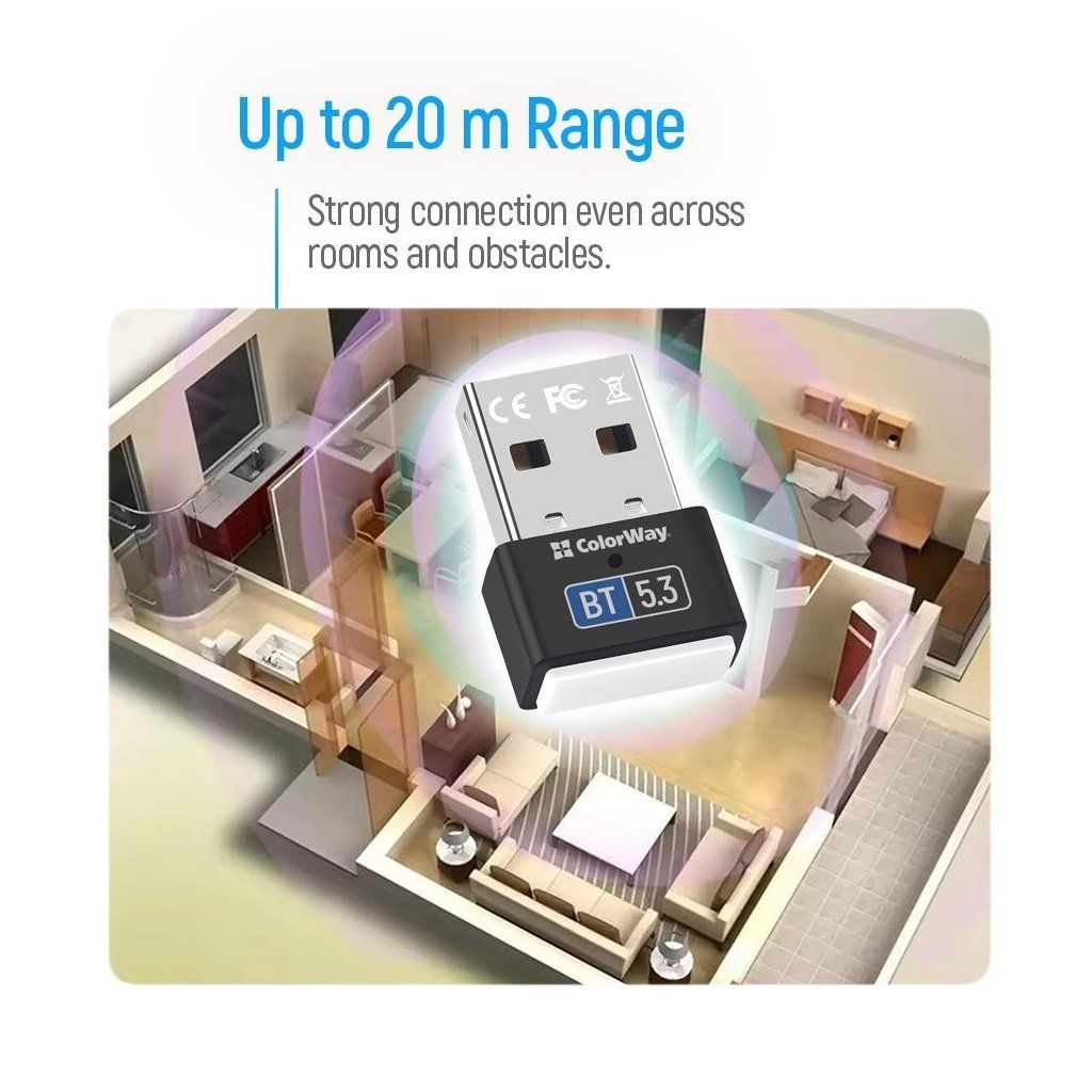 Adaptér ColorWay Bluetooth BT 5.3 nabízí dosah až 20 metrů, a tak vám poskytne spoustu prostoru pro pohyb, aniž byste museli sedět hled vedle svého zařízení.