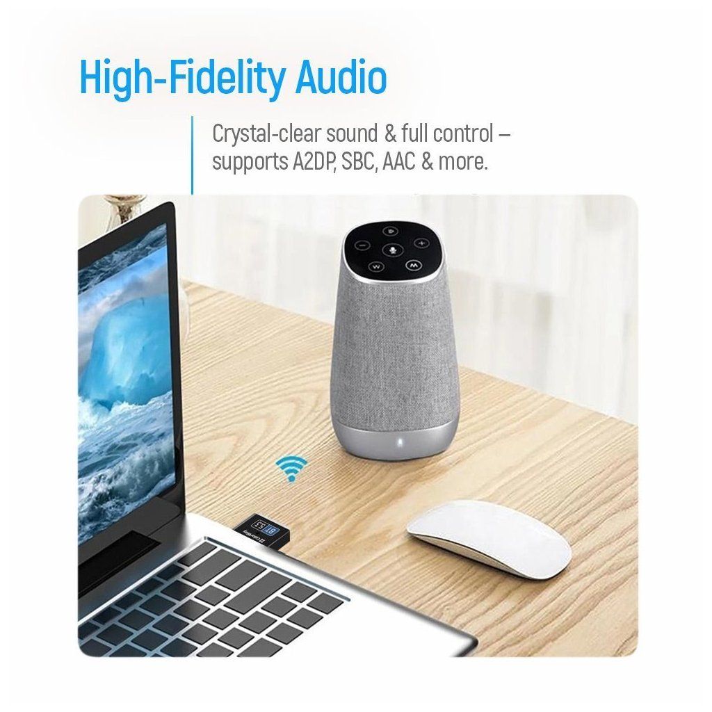 Adaptér vyniká zpětnou kompatibilitou s verzemi Bluetooth 2.0 až 5.2, takže funguje se zařízeními všech generací. Díky funkci Plug & Play pro Windows 8.1 a novější není potřeba instalovat žádné ovladače.