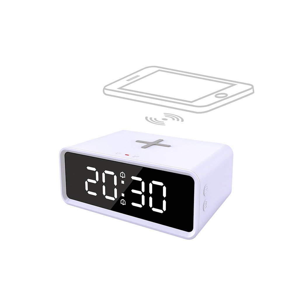 Tento moderní budík kombinuje bezdrátovou nabíječku (Qi, max. 15W), hodiny, teploměr a dvojitý budík s funkcí snooze. Velký LED displej s vysokým rozlišením umožňuje volbu mezi zobrazením pouze času nebo střídáním času a teploty. Nastavitelný jas displeje (3 úrovně + vypnutí) zajišťuje pohodlné používání i v noci. Protiskluzová podložka udrží telefon bezpečně na místě během nabíjení. Napájení přes DC5V-9V/2-3A, záložní baterie CR2032 uchová nastavení při výpadku napájení.