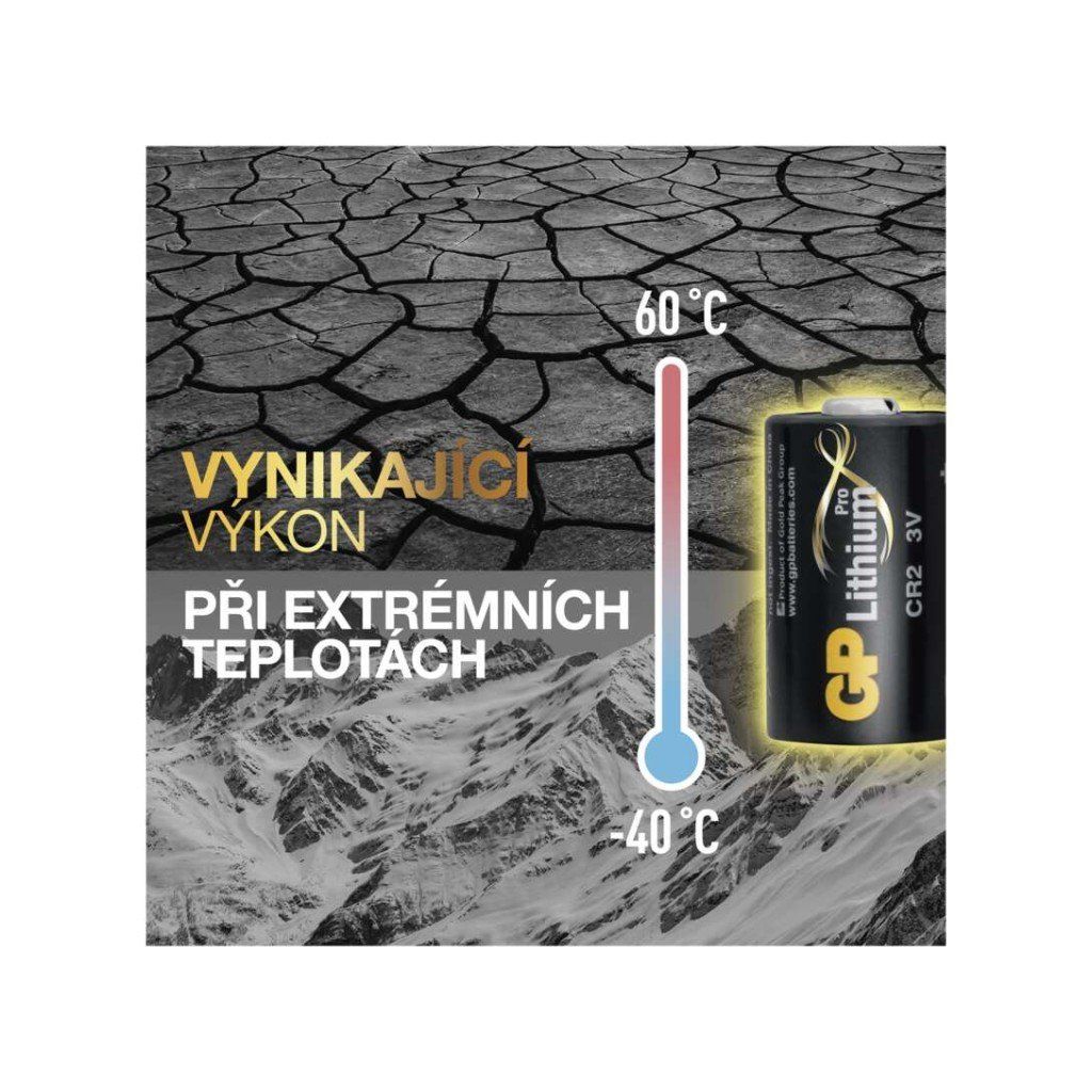 chemické složení: lithiové|hmotnost: 10 g|kapacita: 800 mAh|kategorie/řada: Lithium|max. skladovatelnost: 10 let|možnost nabíjení: ne|napětí: 3 V|počet nabíjecích cyklů: nenabíjecí|prodejní obal: 1 ks, blistr|provozní teplota: -40 °C až +60 °C|rozměr: 15,3 × 26,5 mm|typ: CR2 (DLCR2)|velikost baterie: neuvádí se|značka: GPDoplňkové parametry