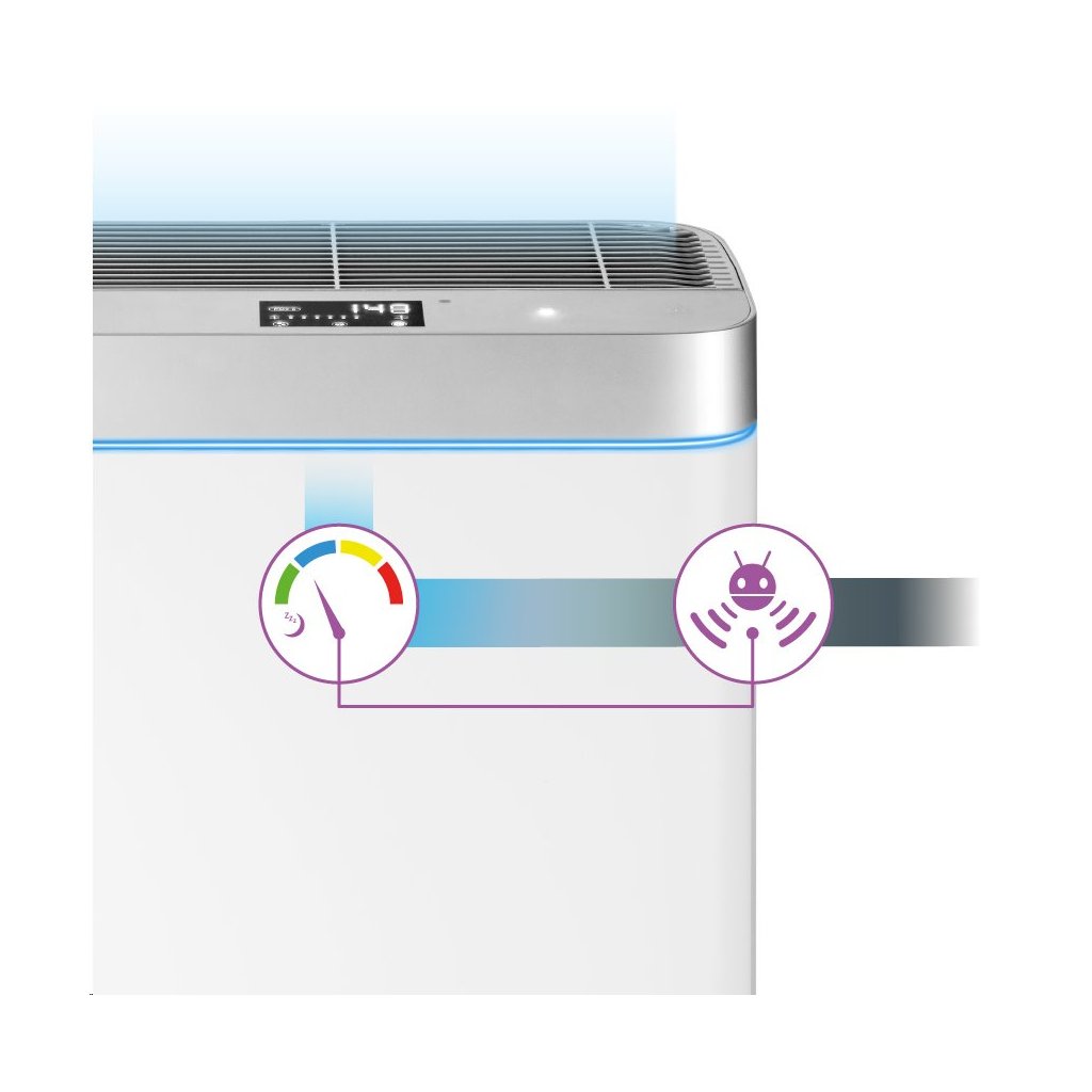 Čistička je opatřena citlivým senzorem znečištění, díky kterému v reálném čase vidíte míru polétavého prachu (PM2,5) v místnosti. Po spuštění pracuje v režimu SMART, který automaticky načte aktuální stav znečištění. Podle zjištěných hodnot si sama nastaví optimální rychlost čištění. Přesná hodnota se zobrazí na přehledném LED displeji. Kvalitu vzduchu můžete vizuálně kontrolovat pomocí barevného podsvícení, které se mění v závislosti na míře znečištění: zelená = vynikající kvalita ovzduší (do 80 PM2,5) • modrá = mírné znečištění (81 – 120 PM2,5) • žlutá = střední znečištění (121 – 160 PM2,5) • červená = vysoké znečištění (161 PM2,5 a více)