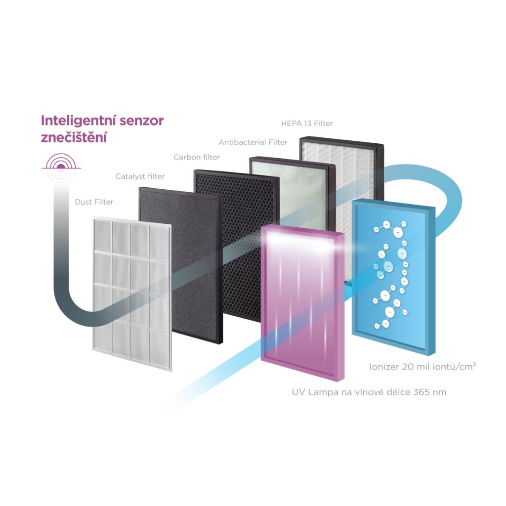 - 7 stupňů filtrace vzduchu (5x filtr + ionizátor + UV lampa)