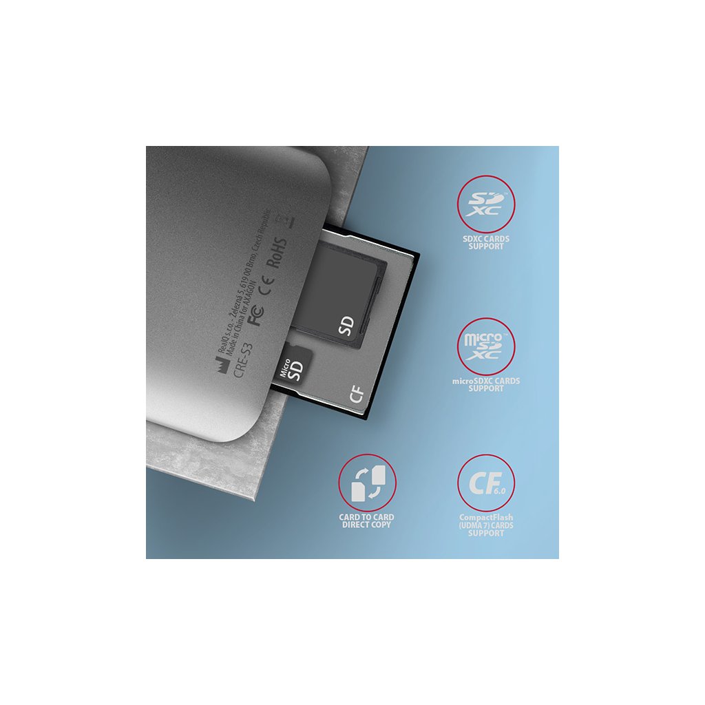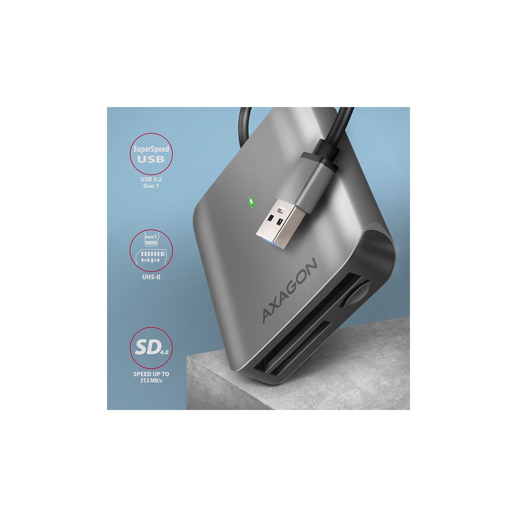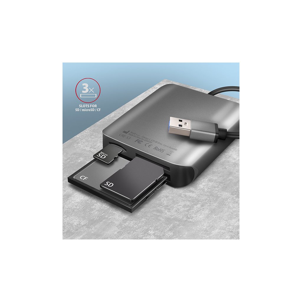 Externí čtečka paměťových karet CRE-S3 značky Axagon, přináší širokou podporu napříč různými typy paměťových karet a především přináší také podporu moderního rozhraní USB 3.2. S touto čtečkou můžete využít na maximum i ty nejvýkonnější karty současnosti.
