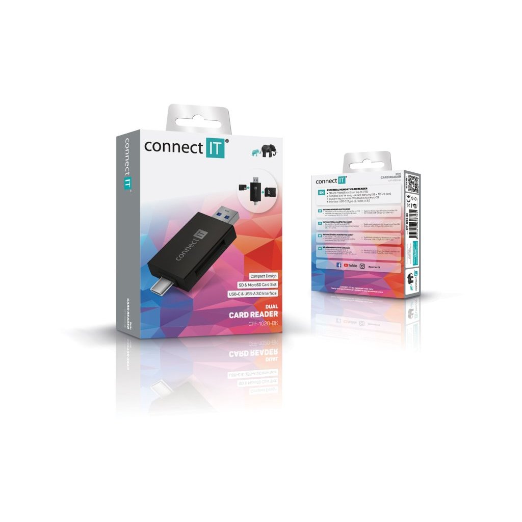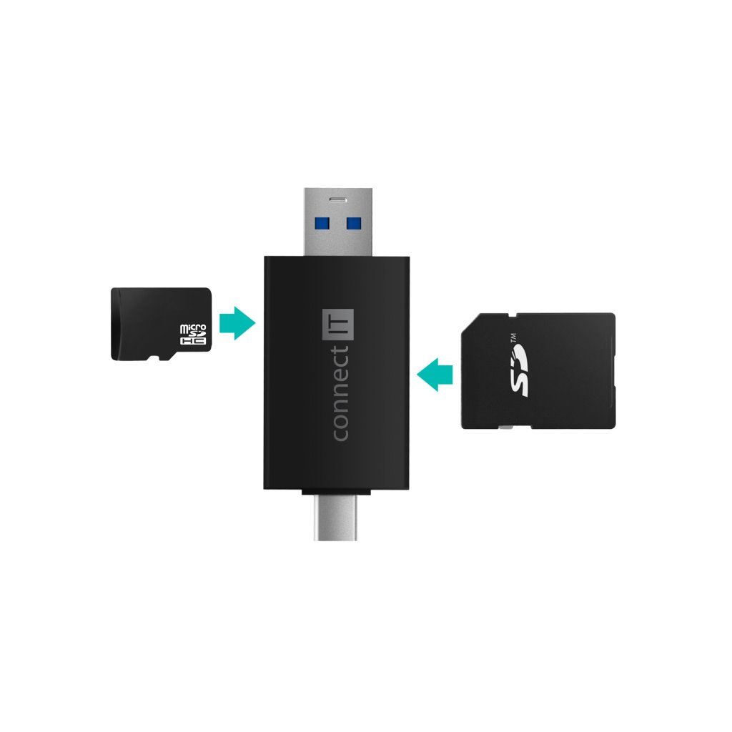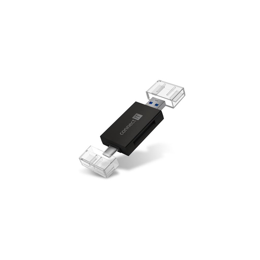 CONNECT IT USB-C/USB-A čtečka karet Dual Gear BLACK --- Praktická externí čtečka paměťových karet s konektory USB-A 3.0 a USB-C Dual Gear umožňuje kdekoliv přenášet obsah mezi vašimi paměťovými kartami a počítačem. Používá (zpětně kompatibilní) vysokorychlostní rozhraní USB 3.0, díky němuž je zajištěn bezproblémový a bleskový přenos dat mezi zařízeními. Čtečka má tvar flashdisku, takže ji lze snadno přepravovat a vzít si ji třeba i na cesty. Potěší i praktické krytky USB konektorů, které zabraňuje vniknutí nečistot a prachu, čímž předchází jakýmkoliv problémům. Přenosová rychlost 5 Gbps --- Štíhlé tělo čtečky nebrání ve využití vedlejších USB portů počítače, matný povrch čtečky omezuje tvorbu otisků prstů.Podporuje všechny současné verze SD a microSD karet včetně SDXC a microSDXC do kapacity 2TB. --- USB port: 1.1 a vyšší Přenosová rychlost 5 Gbps Kompatibilní s: T-Flash Micro SD Micro SDHC Micro SDXC SD SDHC SDXC Systémové požadavky: Windows XP/Vista/7/10/11, Mac OS 10.1.2 a vyšší --- Obsah balení: USB 3.0/USB-C čtečka karetDoplňkové parametry