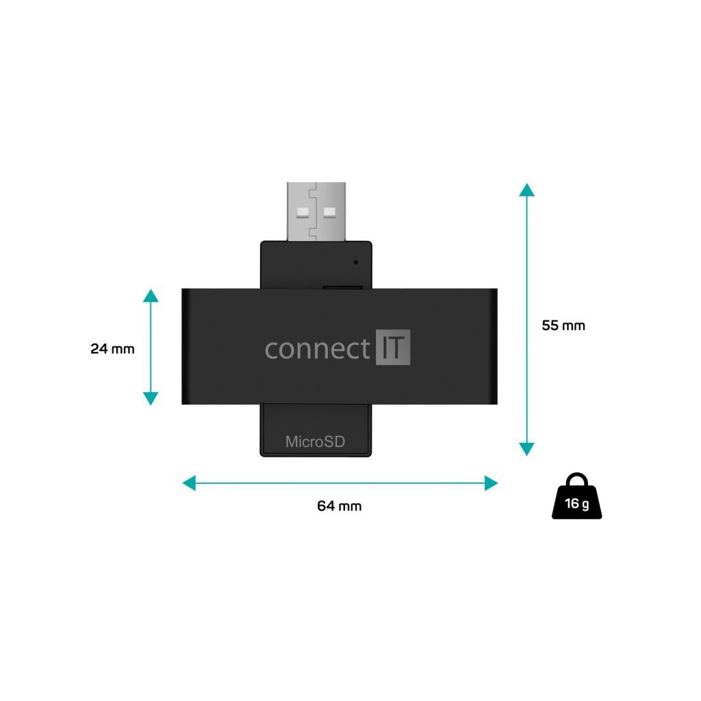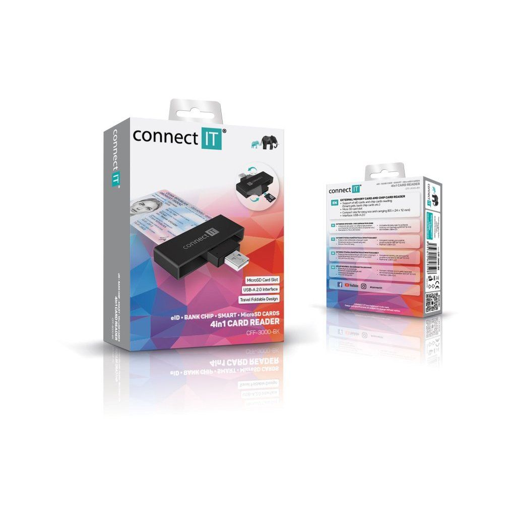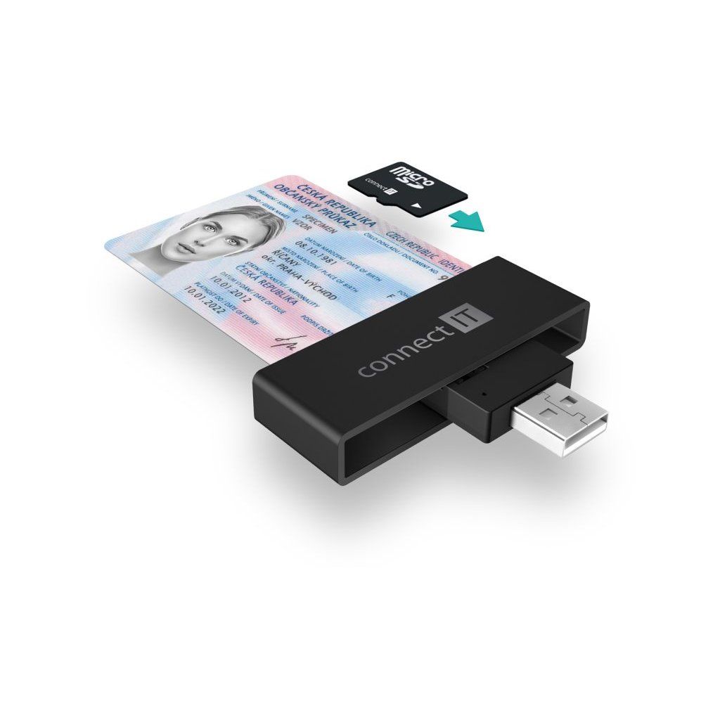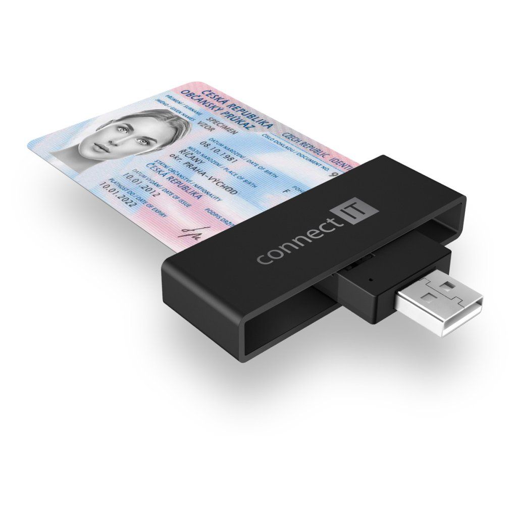 CONNECT IT USB čtečka eObčanek a čipových karet, ČERNÁ Popis produktu: Smart eID, Černá --- Externí čtečka eObčanek a čipových karet s rozhraním USB-A, slotem pro Micro SD paměťové karty a praktickým vyklápěcím designem. --- Praktická externí čtečka eObčanských průkazů Vám umožní připojit se k účtům státní správy ať jste kdekoliv. Je kompatibilní s bankovními čipovými kartami a většinou smart karet a nechybí ani slot pro microSD pamětové karty. Používá zpětně kompatibilní rozhraní USB 2.0, díky němuž je zajištěn bezproblémový a rychlý přenos dat mezi zařízeními. Čtečka má tvar flashdisku, takže ji lze snadno přepravovat a vzít si ji třeba i na cesty. Štíhlé tělo čtečky nebrání ve využití vedlejších USB portů počítače, matný povrch čtečky omezuje tvorbu otisků prstů. Podporuje eObčanky s čiipem, bankovní čipové karty a microSD paměťové karty. --- Rozhraní: USB-A 2.0 Slot Smart Card s podporou: - eObčanek - bankovních karet s čipem - Smart karet Slot na paměťové karty s kompatibilitou: - Micro SD - Micro SDHC - Micro SDXC - Trans Flash Automatická detekce karet Přenosová rychlost 480 Mbit/s Vyklápěcí konstrukce pro ochranu USB konektoru a snadnou přenositelnost při cestování Podporuje smart karety splňující ISO 7816, třídy A, B a C (5V, 3V and 1.8V) Podpora standardů ISO 7816, EMV 4.1 (EMV 2000 level 1) Podpora protokolů T0 a T1, I2C, SLE 4432/42 (S=10), SLE 4418/28 (S=9) Podpora PC standardu pro smart karty PC/SC 2.0 Podpora I2C karet SLE4418, SLE4428, SLE4432, SLE4442, SLE4436, SLE5536, SLE6636, AT88SC1608, AT45D041 Podpora standardu Microsoft WHQL Podpora standardu USB-IF CCID Napájení čtečky přes USB rozhraní (Bus-Power) nevyžaduje externí napájecí zdroj Kompaktní rozměry pro snadné použití a přenášení Univerzální kompatibilita s Windows i Mac operačními systémy Snadná instalace Plug & Play bez nutnosti instalace a stahování ovladačů (čtečku stačí pouze připojit k USB portu počítače nebo notebooku) Rozměry (délka × hloubka × výška): 65 × 24 × 12 mm Hmotnost: 16 g --- Obsah balení: USB 2.0 čtečka karetDoplňkové parametry