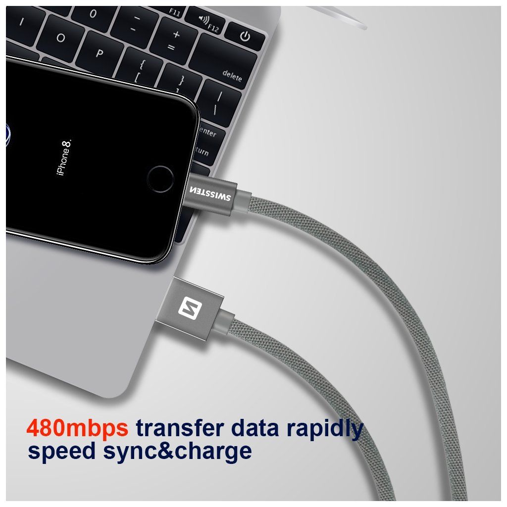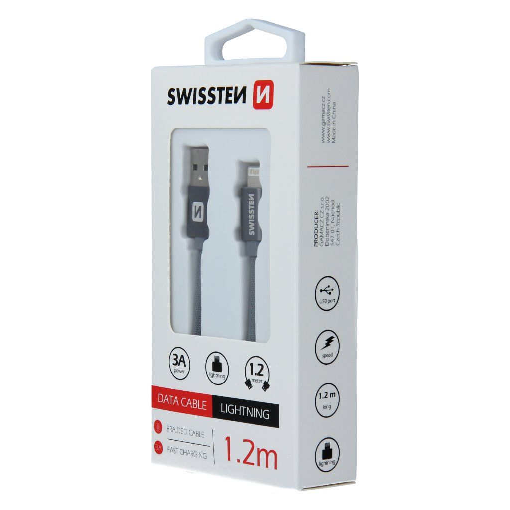 Datový kabel Swissten USB/Lightning s kvalitním textilním opletením a kovovými kryty konektorů. Díky délce 1,2m je vhodný do auta, na stůl v kanceláři nebo na noční stolek. Kabel je zesílený a přenese tak větší proud (až 3A) a zvládne i rychlý přenos dat 480 Mb/s. Životnost kabelu v ohybu je více než 10000 ohybů. Kovový kryt konektoru je odolnější proti mechanickému poškození než běžné plastové kryty konektorů.Technické parametry: