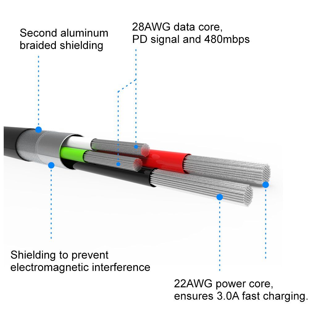 - dva pocínované měděné vodiče, kde každý 22 AWG 70/0,01 (to znamená, že každý vodič má 70 pramenů tenkých 0,01 mm, (např originální kabel Apple MD818 má 37 pramenů o tloušce 0,08 mm) + vnější plášť TPE (měkký plast)