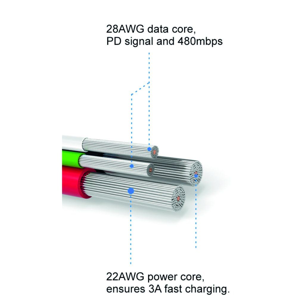- dva pocínované měděné vodiče, kde každý 22 AWG 70/0,01 (to znamená, že každý vodič má 70 pramenů tenkých 0,01 mm, (např originální kabel Apple MD818 má 37 pramenů o tloušce 0,08 mm) + vnější plášť TPE (měkký plast)