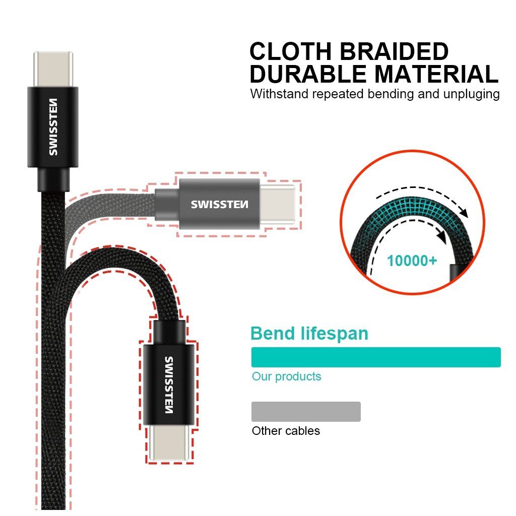 Datový kabel Swissten USB-C/USB-C s kvalitním textilním opletením a kovovými kryty konektorů. Díky délce 1,2m je vhodný do auta, na stůl v kanceláři nebo na noční stolek. Kabel je zesílený a přenese tak větší proud (až 3A) a zvládne i rychlý přenos dat 480 Mb/s. Životnost kabelu v ohybu je více než 10000 ohybů. Kovový kryt konektoru je odolnější proti mechanickému poškození než běžné plastové kryty konektorů.Technické parametry: