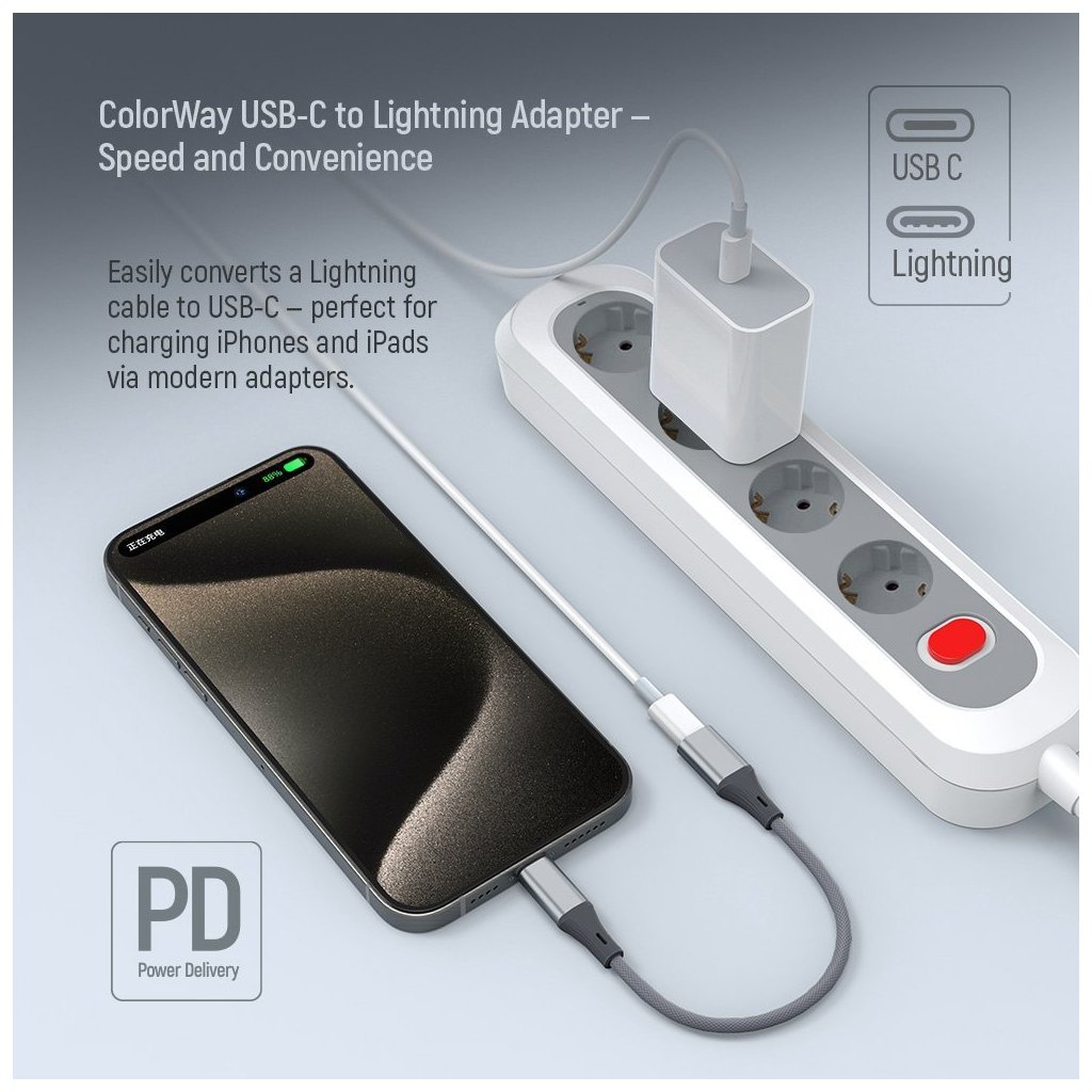 Adapter ColorWay umožňuje jednoduché připojení Apple zařízení s Lightning konektorem k nabíječkám a zařízením vybaveným USB-C portem.