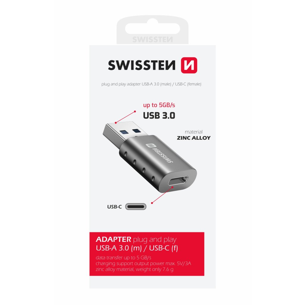 SWISSTEN ADAPTER USB-A(M)/USB-C(F) pro připojení příslušenství s konektorem USB-C do zařízení s USB. Baleno v blistru SWISSTENDoplňkové parametry