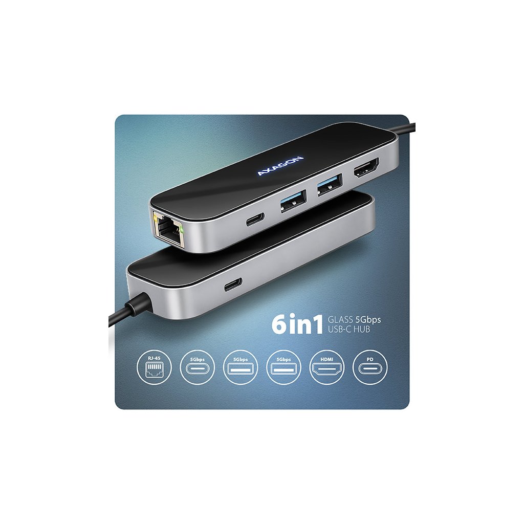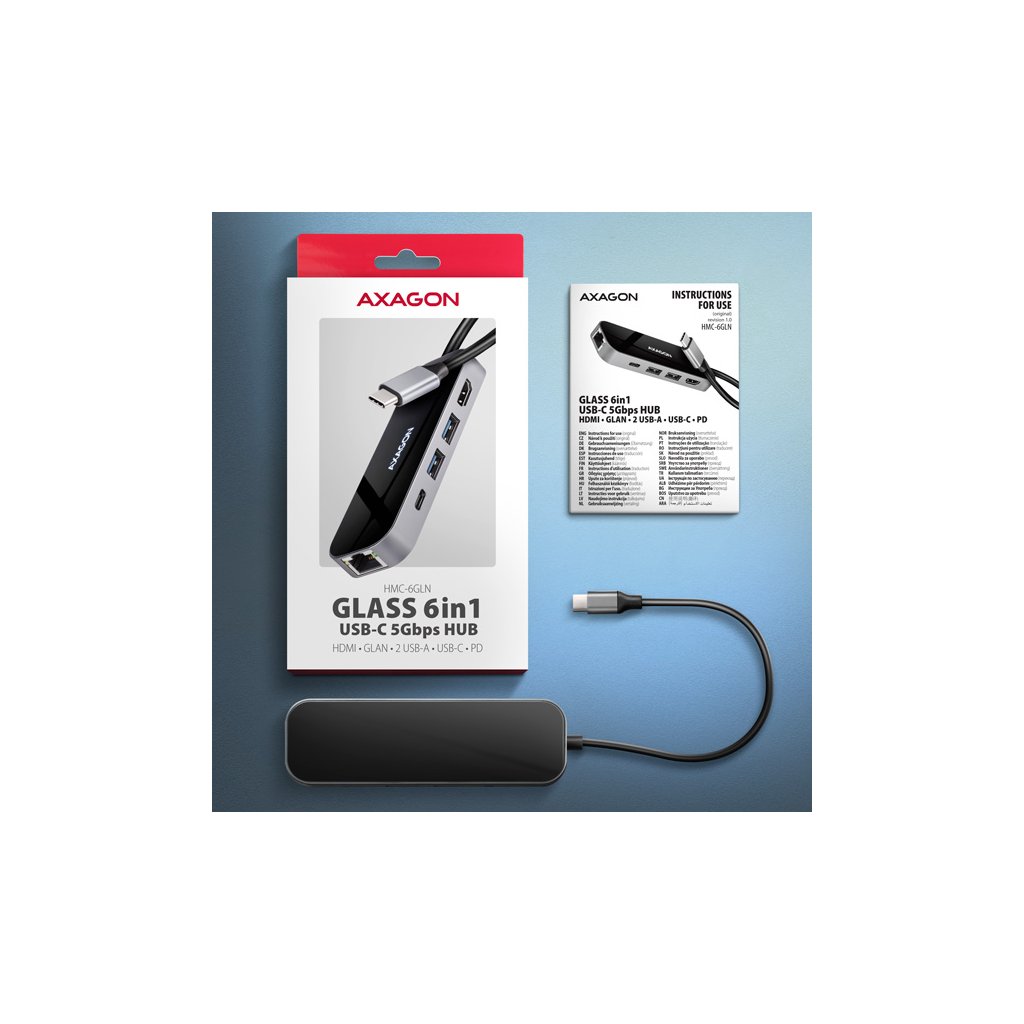 AXAGON HMC-6GLN GLASS je kompaktní USB-C hub s šesti porty, který rozšíří možnosti vašeho notebooku, počítače nebo telefonu. Díky USB 5Gbps rozhraní získáte rychlé datové přenosy, připojení externího monitoru přes HDMI 4K/60Hz, Gigabitový Ethernet a podporu Power Delivery až 100W. Hub se připojuje prostřednictvím 20cm kabelu s konektorem USB-C a funguje jako praktická dokovací stanice pro moderní zařízení.