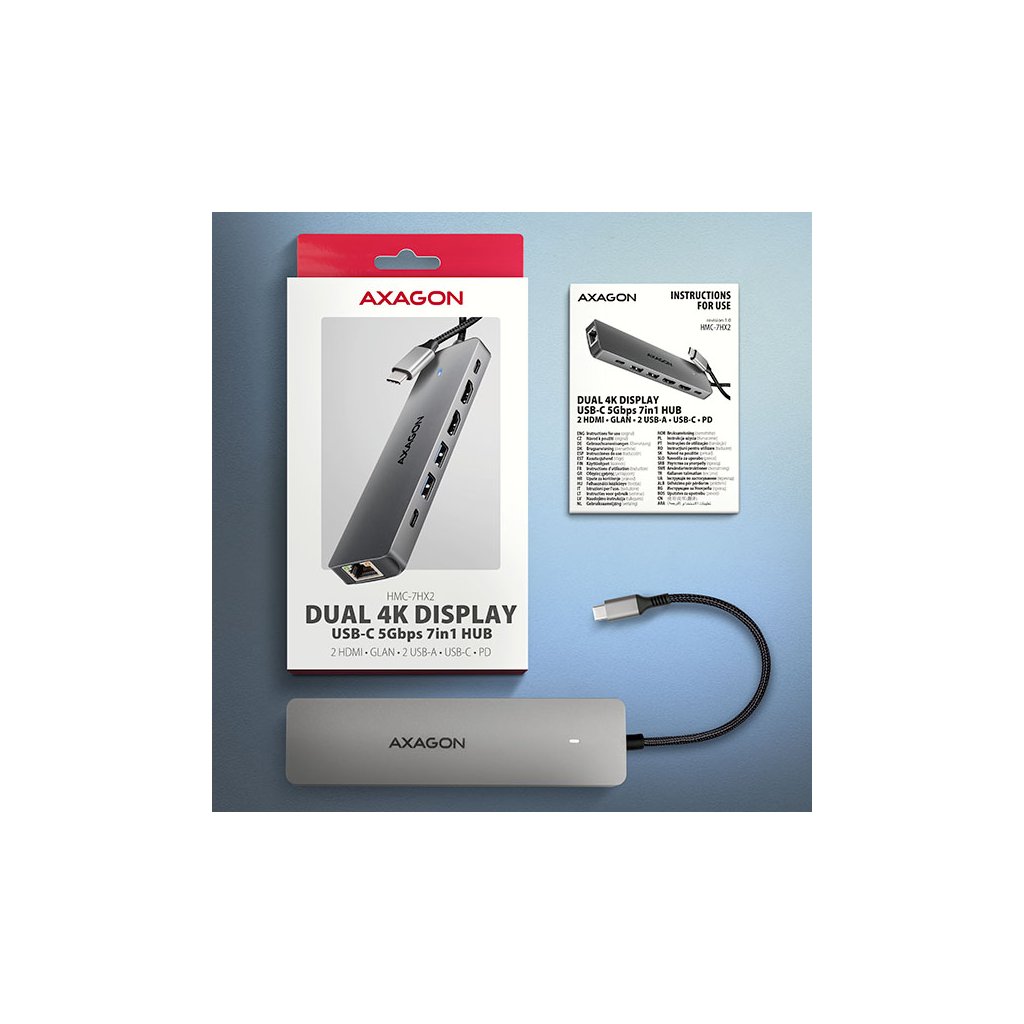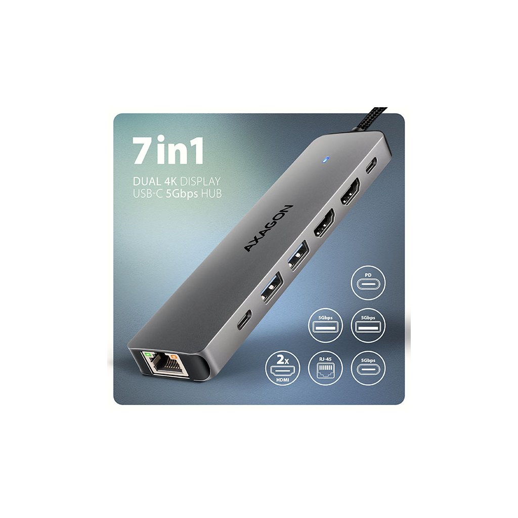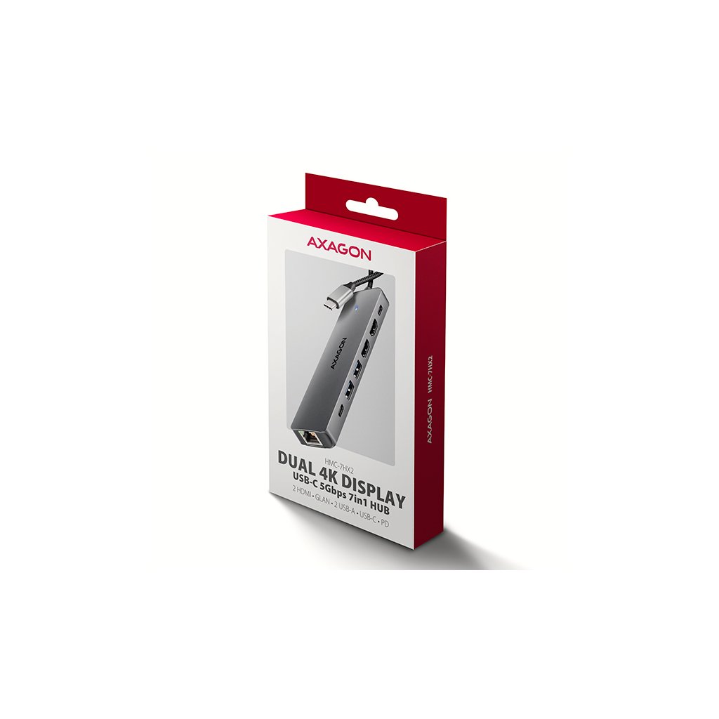 Multiportový USB-C 5Gbps AXAGON HMC-7HX2 DUAL 4K DISPLAY 7in1 hub rozšíří váš notebook, počítač nebo telefon o sedm portů. Váš notebook připojíte k hubu přes 15 cm dlouhý USB-C kabel. Okamžitě tak máte k dispozici připojení pro dva 4K monitory, tři USB zařízení a konektor RJ-45 pro Gigabitovou ethernet síť. Zároveň získáte možnost napájení notebooku pomocí technologie Power Delivery. Replikátor portů vám poskytne jednoduchou a skladnou dokovací stanici 7v1 pro moderní notebooky.