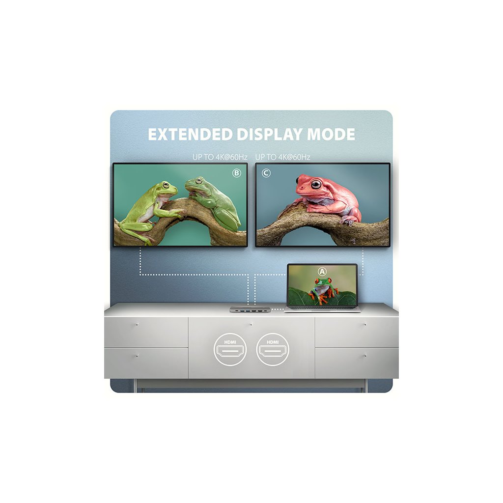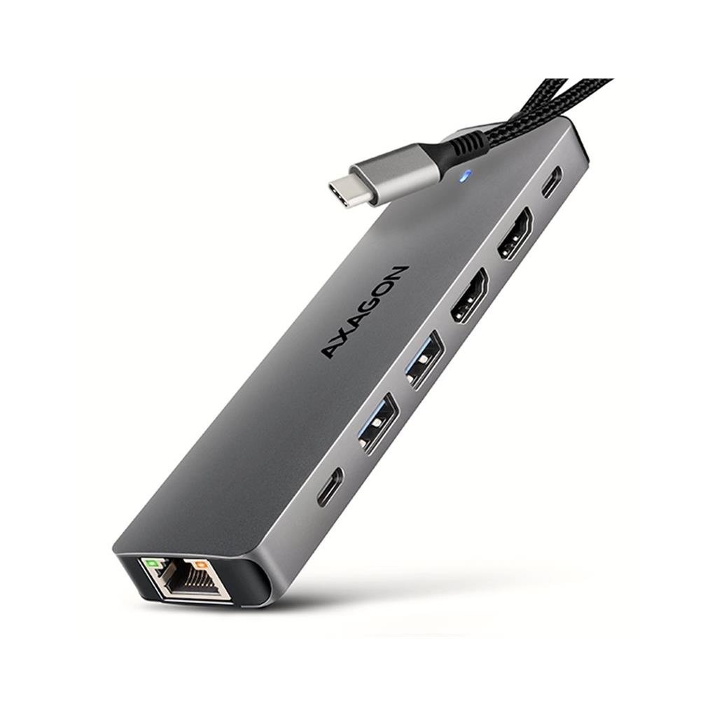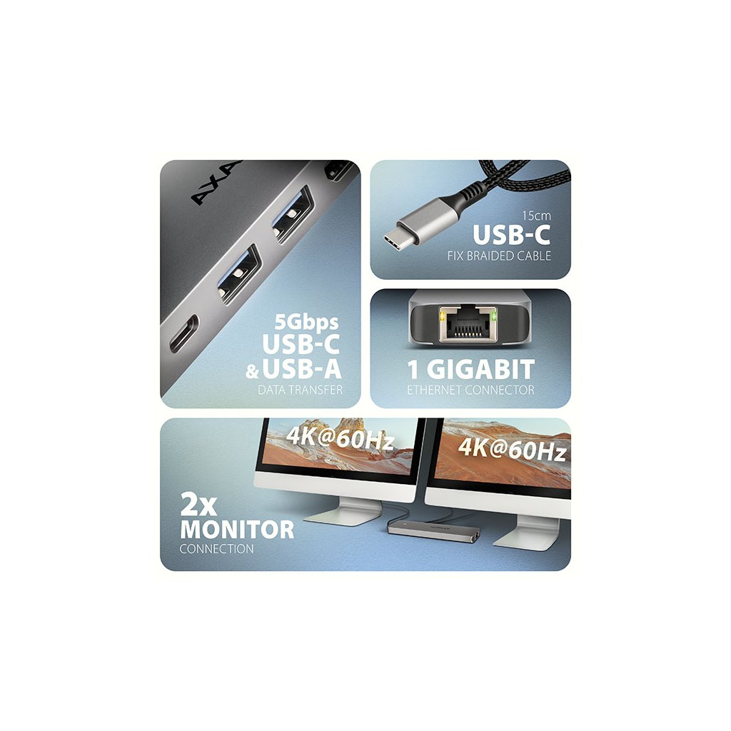 Multiportový USB-C 5Gbps AXAGON HMC-7HX2 DUAL 4K DISPLAY 7in1 hub rozšíří váš notebook, počítač nebo telefon o sedm portů. Váš notebook připojíte k hubu přes 15 cm dlouhý USB-C kabel. Okamžitě tak máte k dispozici připojení pro dva 4K monitory, tři USB zařízení a konektor RJ-45 pro Gigabitovou ethernet síť. Zároveň získáte možnost napájení notebooku pomocí technologie Power Delivery. Replikátor portů vám poskytne jednoduchou a skladnou dokovací stanici 7v1 pro moderní notebooky.