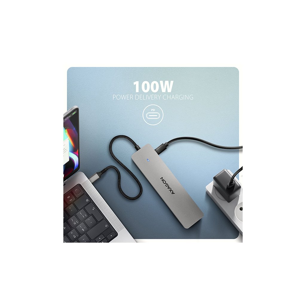 Další z USB-C konektorů je vyhrazen pouze pro nabíjení telefonů nebo notebooků pomocí technologie Power Delivery 3.0 výkonem až 100W. Do hubu zapojíte vhodnou USB-C Power Delivery nabíječku a hub připojíte k notebooku s podporou Power Delivery. Tím také uvolníte jeden USB-C port.