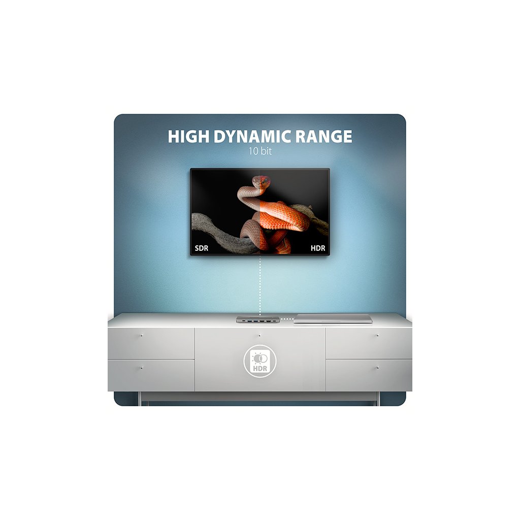 • Podpora HDR (High Dynamic Range, 10 bit support) - realistická reprodukce světlých a tmavých detailů.
