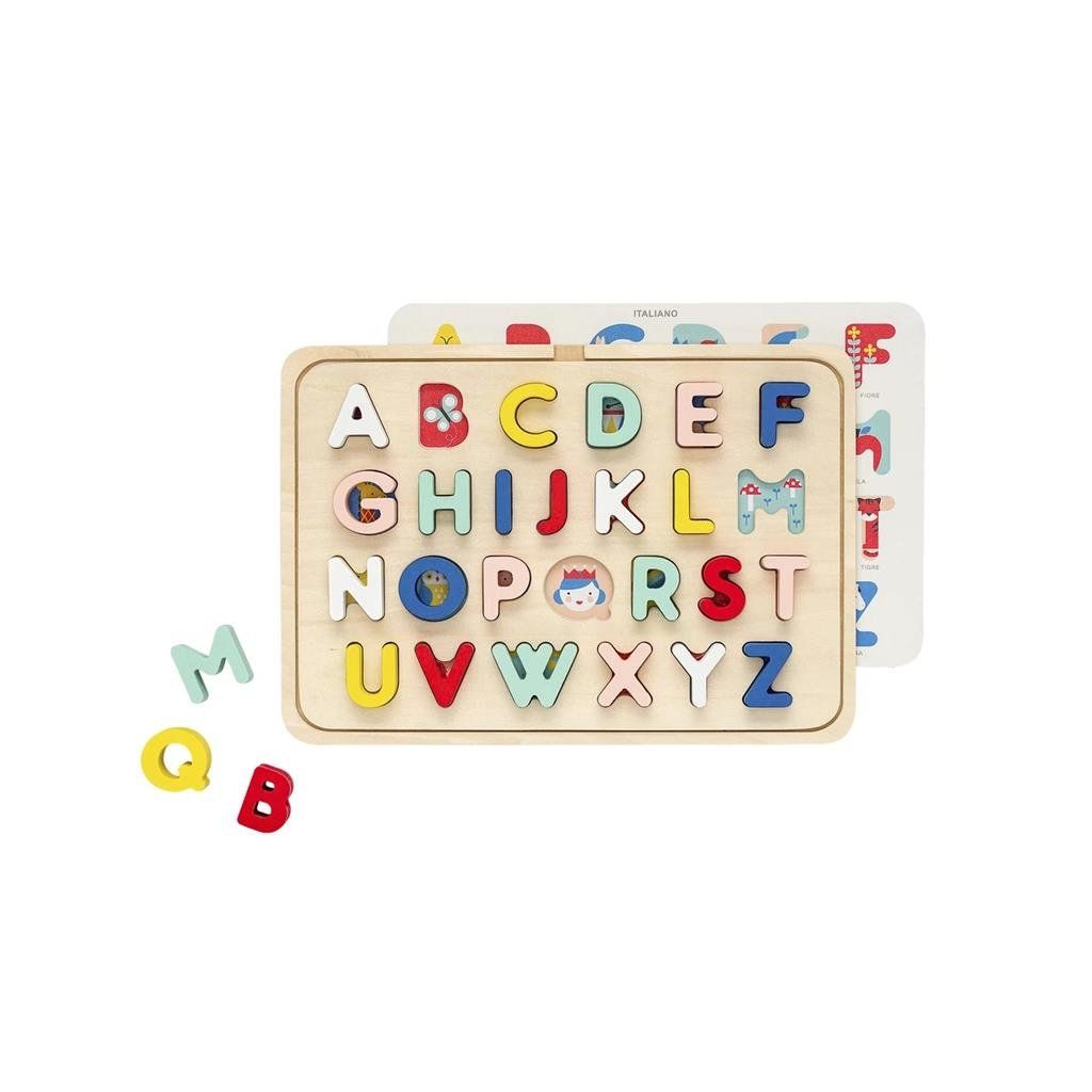 S touto barevnou abecedou si děti mohou procvičit svou znalost abecedy a naučit se nová slovíčka v angličtině, francouzštině, italštině či němčině. Inovativní dřevěné puzzle - po zvednutí písmen pod nimi děti najdou krasné ilustrace, které korespondují s daným písmenem – v angličtině – A apple (jablko), B butterfly (motýl), C cat (kočka). Po otočení vrstvy najdete ilustrace odpovídající i 3 dalším jazykům.