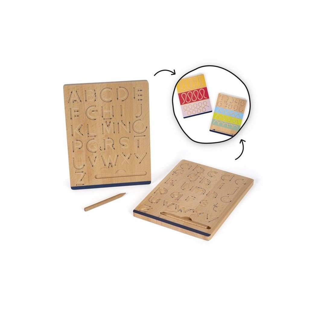 Blíží se škola a Vy máte pocit, že psaní by mohlo být pro Vaše dítě problém? S touto sadou desek pro trénink psaní, vyrobenou z kvalitního FSC® certifikovaného dřeva, se Vaše dítě naučí uchopit psací náčiní a osvojí si základy psaní, a to zábavnou formou a bez použití papíru. Na dvou dřevěných oboustranným deskách najdete šablony s drážkami s různými tvary, číslicemi a písmeny. Přiloženou tužkou bez tuhy projíždí dítě drážkami, šipkami naznačeným směrem a tak se učí, jak číslici či písmeno správně napsat. Součástí je integrovaný zásobník na tužky, aby byly vždy připraveny k použití.