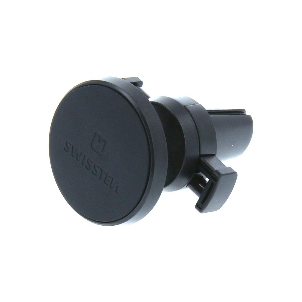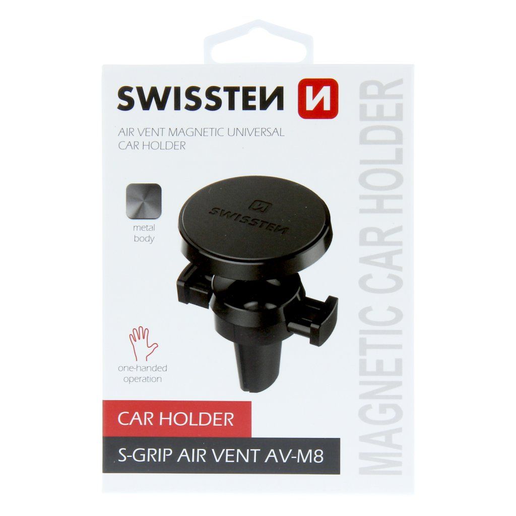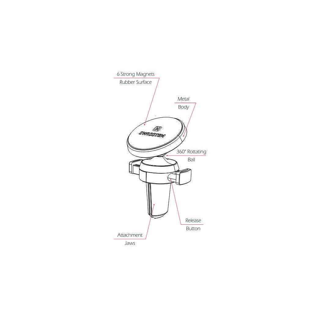 Kovový magnetický držák do auta v elegantním designu. Je opatřen čtyřmi magnety pro lepší zabezpečení telefonu. Pogumovaný povrch ochrání telefon před poškrábáním a zamezí možnost skluzu telefonu. Kloub zajistí možnost natočení do požadovaného směru. Pružinky v čelistech zajistí maximální pevnost uchycení držáku ve větrací mřížce.Baleno v blistru SWISSTEN.