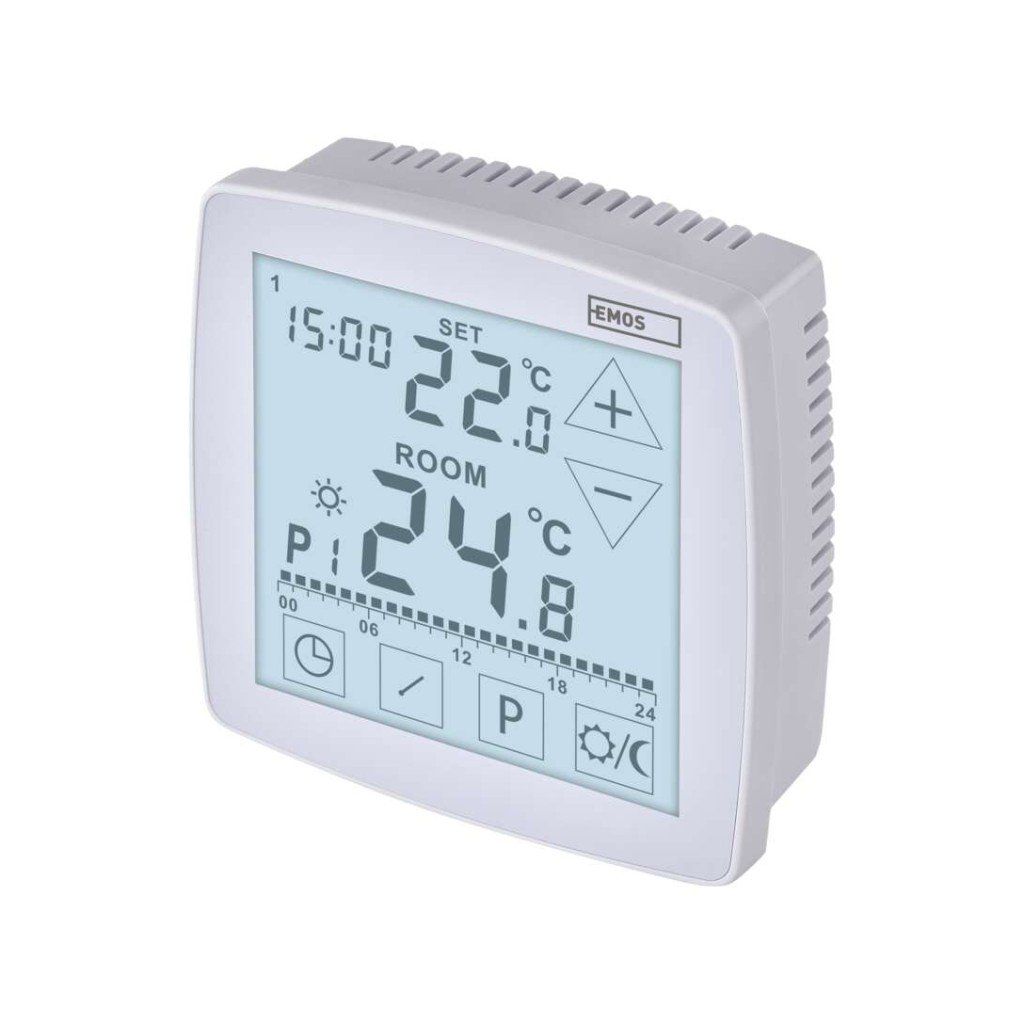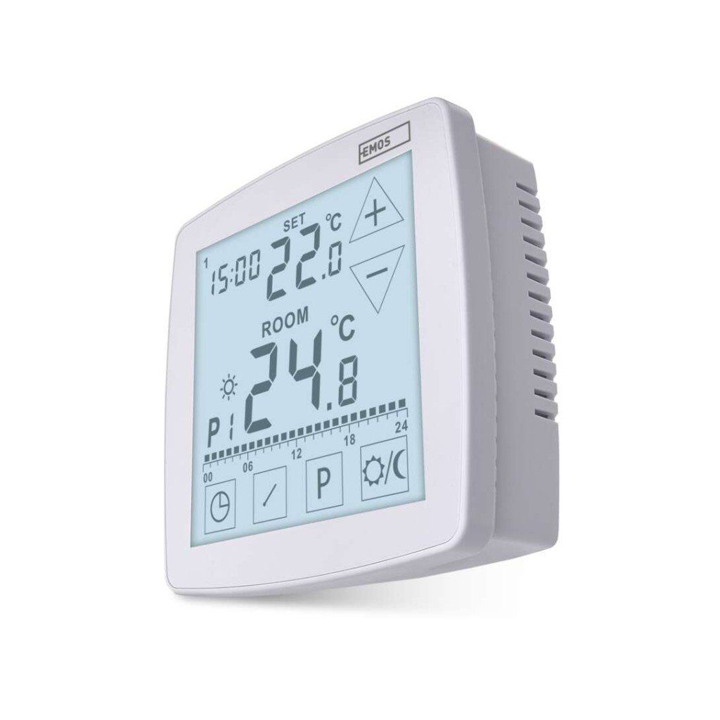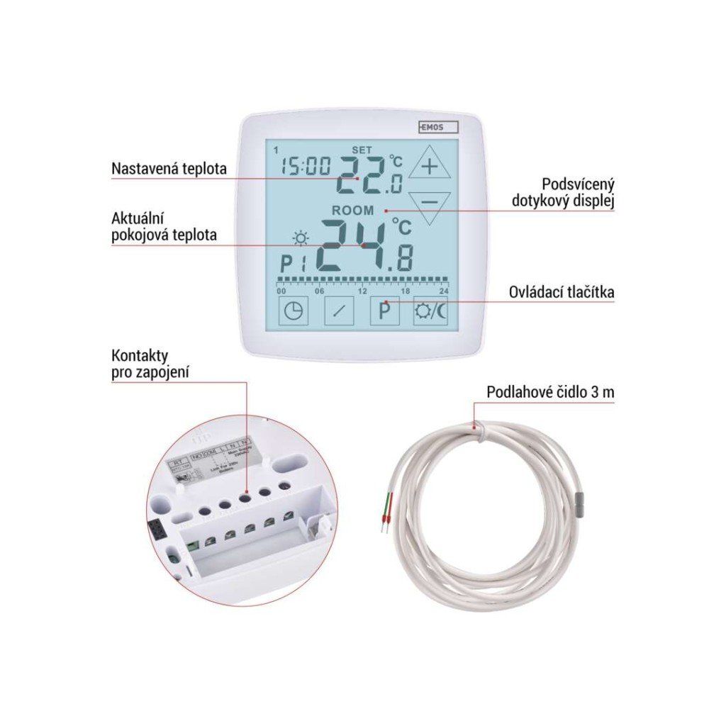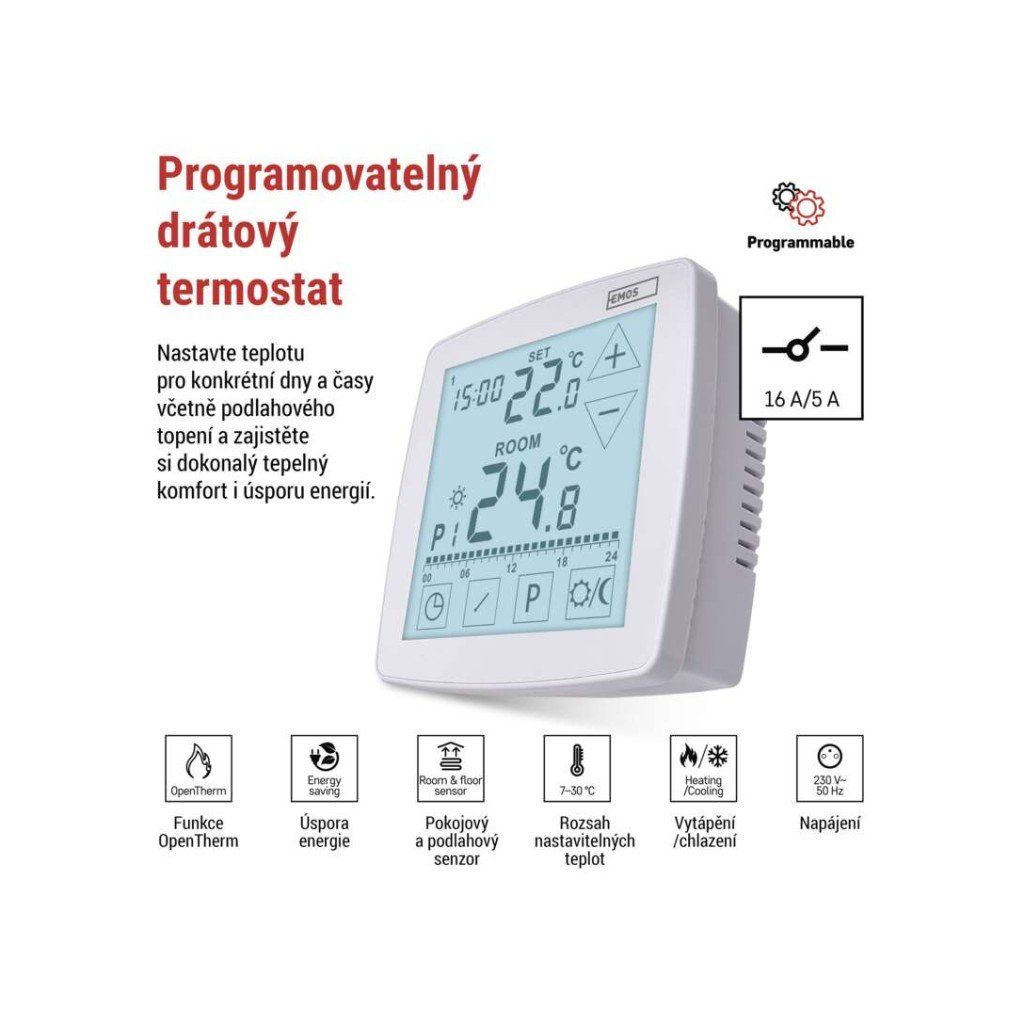 Programovatelný drátový pokojový termostat EMOS P56A01 je určený pro řízení vytápění i chlazení v obytných prostorách. Podporuje komunikaci OpenTherm a zároveň nabízí klasické reléové sepnutí, což zajišťuje flexibilní připojení ke kotlům nebo spínacím okruhům. Termostat umožňuje přesné nastavení teploty v rozsahu 7 °C až 30 °C s krokem 0,2 °C a zahrnuje 3 m podlahové čidlo pro kontrolu teploty podlahy.