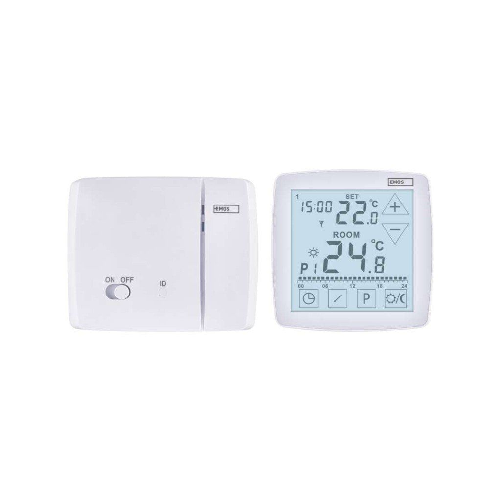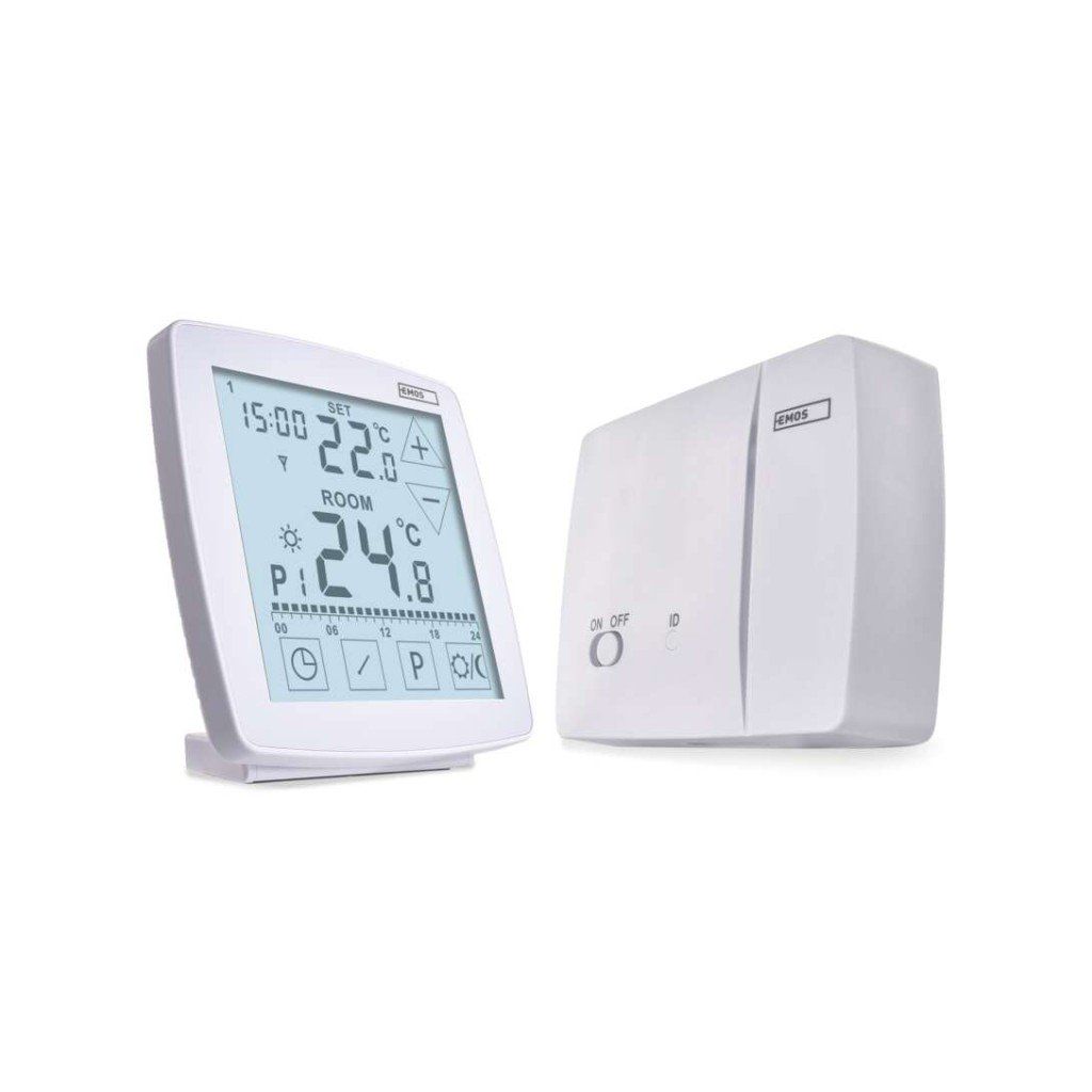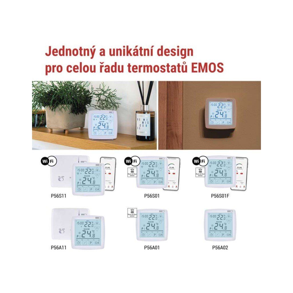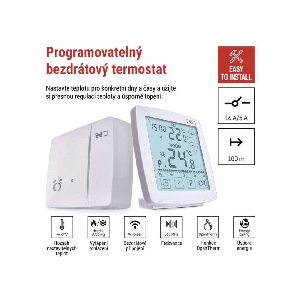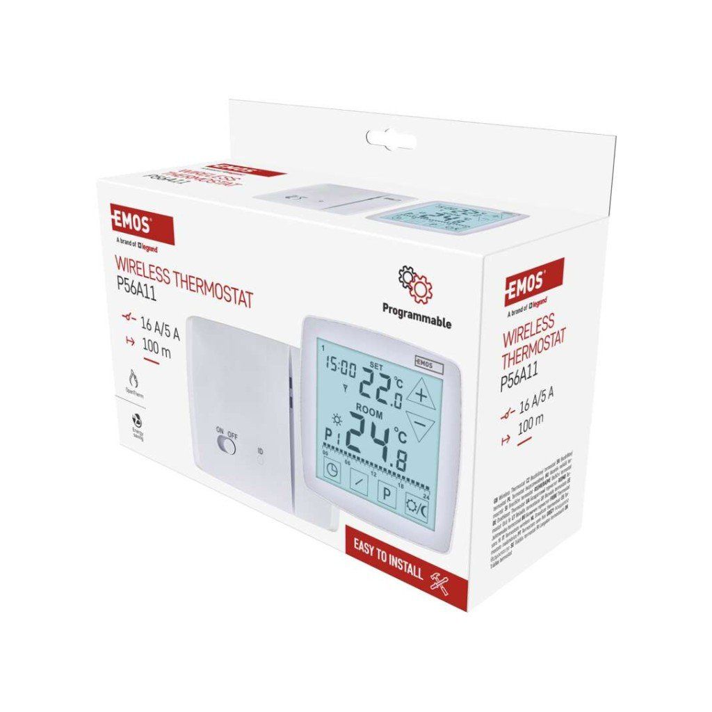 EMOS P56A11 je bezdrátový programovatelný pokojový termostat určený pro řízení vytápění i chlazení. Nabízí možnost komunikace s kotlem prostřednictvím protokolu OpenTherm a současně standardní reléový výstup, což zajišťuje širokou kompatibilitu s topnými systémy. Termostat umožňuje přesné nastavení teploty v rozsahu 7 °C až 30 °C s krokem 0,2 °C a disponuje přehledným podsvíceným displejem pro snadné ovládání.