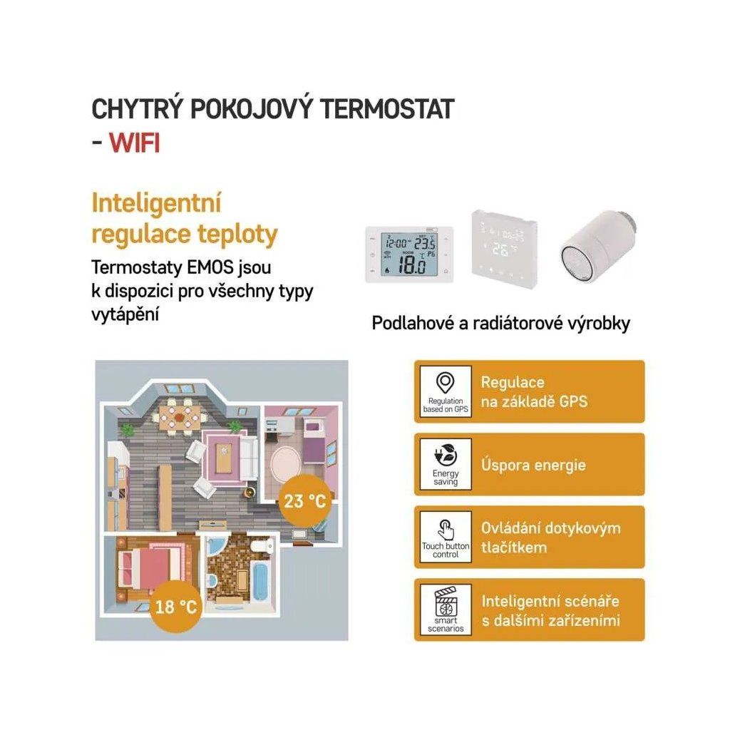 - Vzdálené ovládání - kompletní kontrola termostatu přes mobilní aplikaci EMOS GoSmart z jakéhokoliv místa