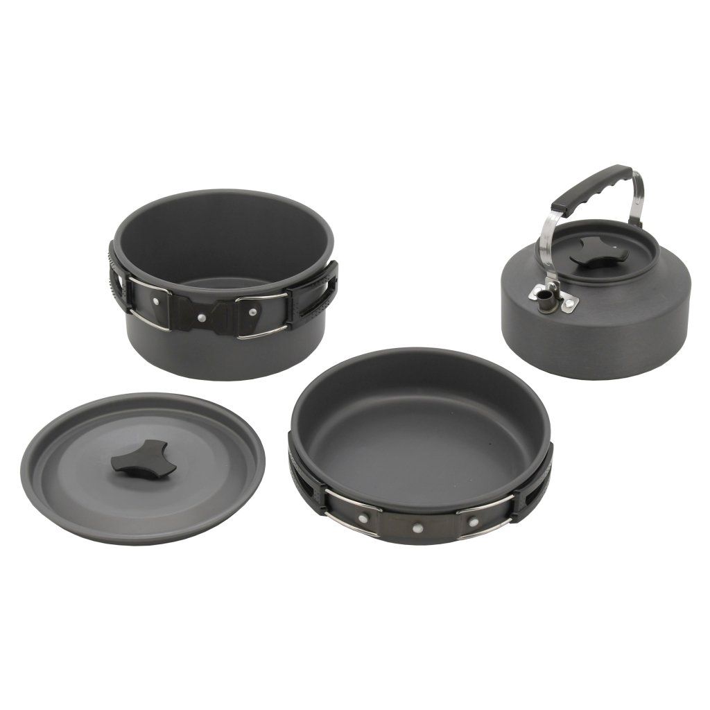 Sada je tvořena pánvičkou 18 x 4 cm, kotlíkem 17 x 9 cm, konvicí 15 x 7,5 cm a víkem průměru 17 cm. Veškeré vybavení je opatřeno sklápěcím držákem, zakončený plastovou rukojetí pro usnadněnou manipulaci.