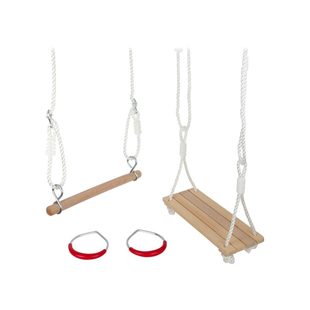 Zábava s houpačkami x3! S tímto setem houpaček, který se skládá z houpačky jednoduché, visuté hrazdy a kovových gymnastických kruhů s plastovými madly, děti zapomenou na význam slova nuda. V balení dvě sady lan, která jsou odolná proti přírodním vlivům, jsou nastavitelná díky lanové osmě. Pro každou houpačku tak můžete nastavit optimální výšku! Díky dvěma sadám lan můžete používat dvě houpačky zároveň. Jednoduché zavěšení. Praktická a multifunkční hračka do domu i na zahradu.
