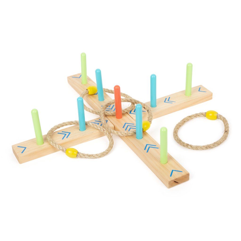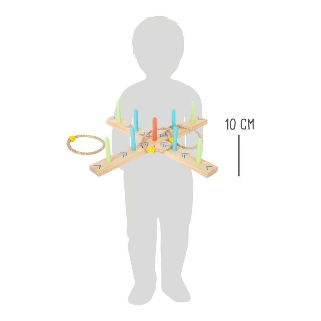 Kdo má nejlepší mušku? V této hře házení krůhu musíte trefit pletené kroužky na 9 kolíků dřevěné základny. Skóre vypočítáte podle barevných šipek, body tak spočítají i děti, které ještě neumí poznávat čísla. Hru lze jednoduše složit a zase rozložit, můžete ji skladovat v bavlněném pytlíku s poutkem, v kterém je od výroby zabalena. Perfektní hra, s kterou si děti užijí mnoho hodin zábavy. Trénuje koordinaci ruka-oko a zručnost. Základna je vyrobena ze 100% certifikovaného FSC® dřeva.