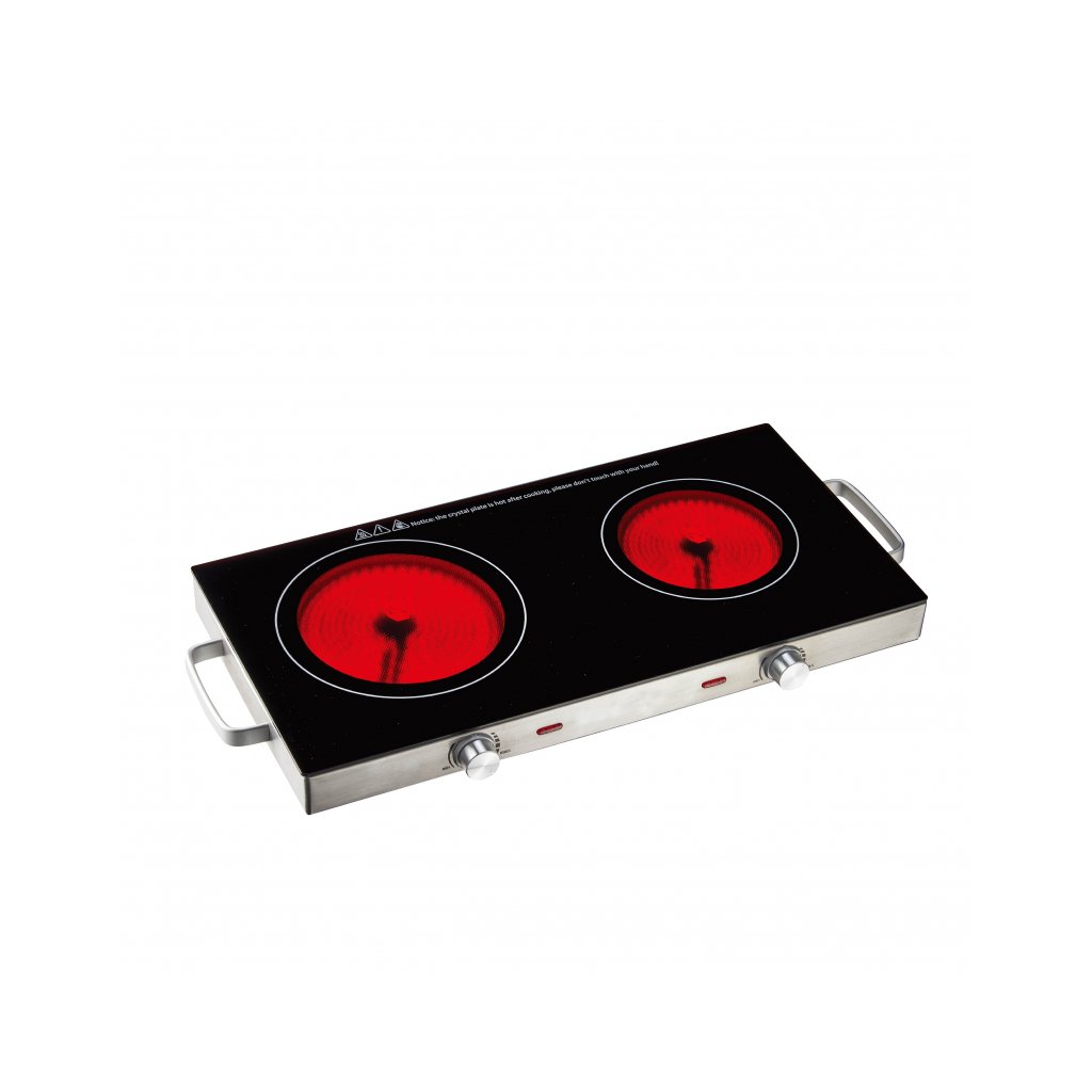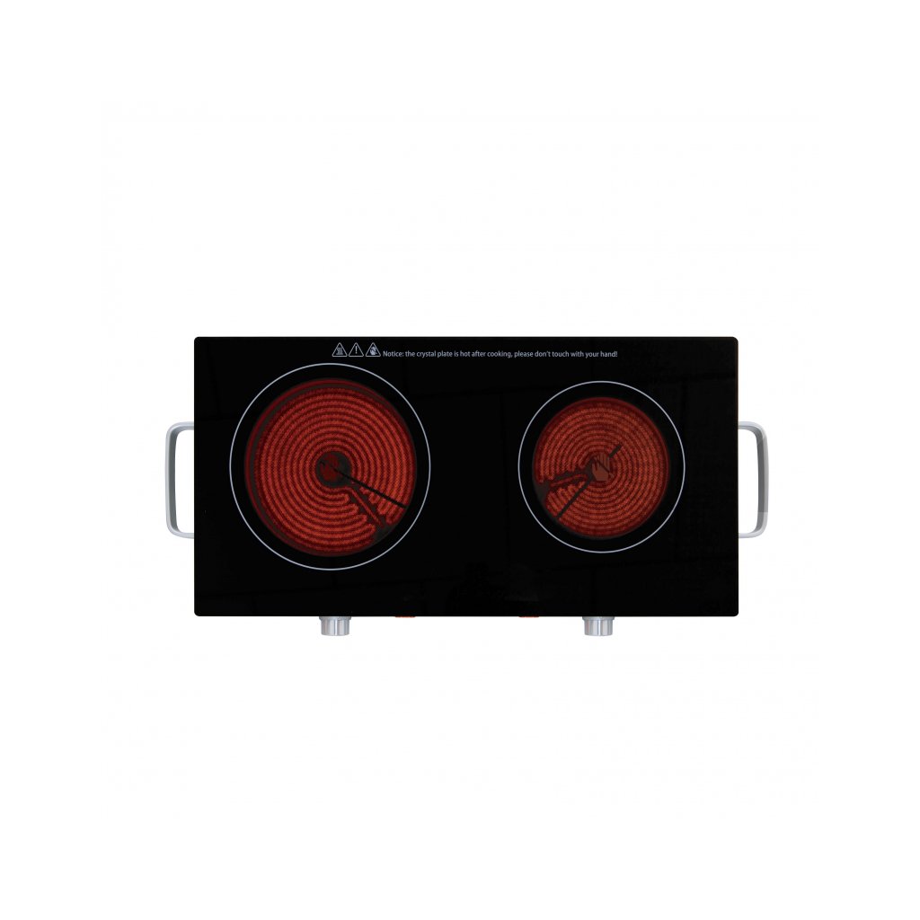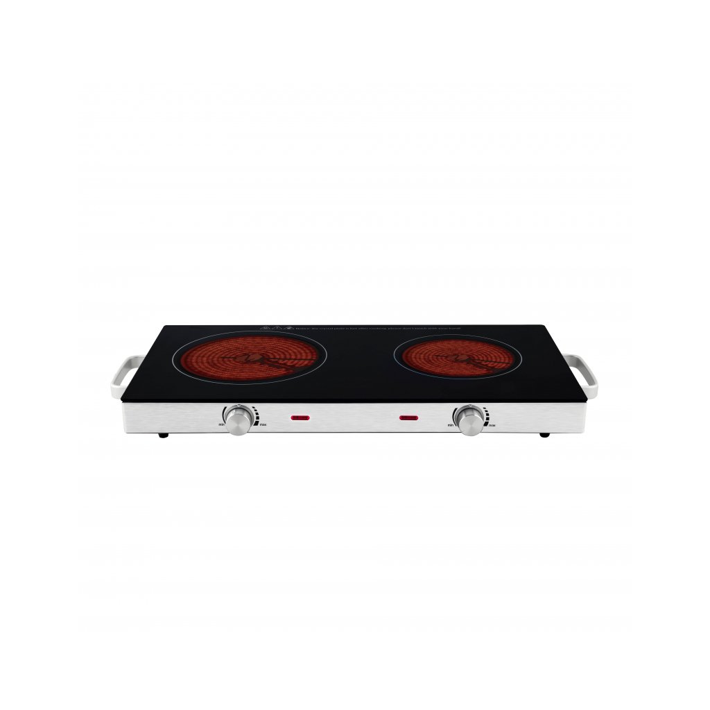 Sklokeramický dvouplotýnkový vařič B-4971 Bravo B-4971 je sklokeramický jednoplotýnkový vařič s příkonem 2800 W a průměrem plotýnky 165 a 200 mm. Má nerezový rám, plynule nastavitelný termostat a světelnou kontrolku provozu. Díky kompaktním rozměrům je ideální do malých domácností, na chatu, do kanceláře nebo na cesty. Povrch je snadno čistitelný a zařízení nabízí rychlý a rovnoměrný ohřev. Popis: - sklokeramický povrch - kontrolka zapnutí,vypnutí - velká plotýnka o průměru 200 mm - malá plotýnka o průměru 165 mm - termostat - rám z nerezové oceli - držadlo pro snadnou manipulaci - příkon 2800 W ( malá plotýnka 1000 W + velká plotýnka 1800 W )Doplňkové parametry