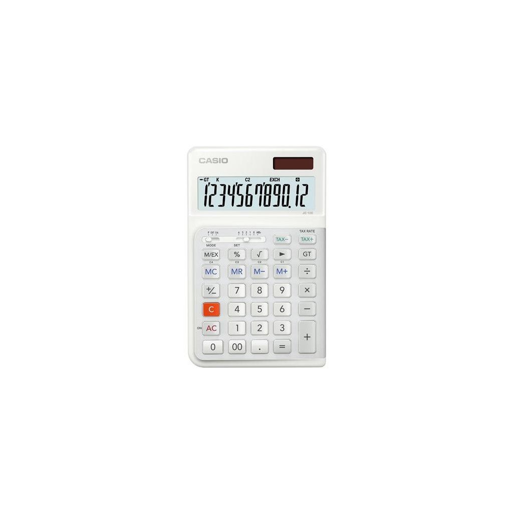 Stolní kalkulačka Casio JE-12E-WE Výpočetní funkce Výpočet DPH Převody měn (3 sazby) Profesionální výpočet procent Výpočet marže s klávesou procent Výpočet odmocniny Klávesa změny znaménka (+/-) Přepínač zaokrouhlování Tlačítko dvojité nuly Vyrovnávací paměť Paměť celkového součtu GT 4tlačítková paměť Displej 12místný LCD displej Indikace zadané funkce Oddělovač řádů/tisíců Duální napájení (solar/baterie) Záložní baterie Automatické vypnutí Plastová tlačítka klávesnice Kovový panel klávesnice Odolné klávesy Heavy-duty Gumové nožičky Ergonomicky tvarovaná tlačítka klávesnice Ergonomická klávesnice pro uživatele-praváky Výhody Ergonomicky designováno pro uživatele-praváky. Klávesnice je konfigurována inovativní schodišťovou konstrukcí se sklonem 3° zleva doprava. V porovnání s konvenčními kalkulačkami tato inovativní konstrukce klávesnice způsobuje menší natočení podpaží a rotaci zápěstí ruky, protože se přizpůsobuje přirozenému držení prstů a ruky. Schodišťová konstrukce umožňuje dokonalé svislé úhozy a tím usnadňuje stisk kláves, snižuje zátěž a pomáhá předcházet úrazům z opakovaného namáhání. Tím se snižuje svalová aktivita těchto 3 svalů: pronator teres, extensor carpi radialis a flexor carpi radialis. Rozměry 111 × 24 × 178 mm Hmotnost 210 gDoplňkové parametry