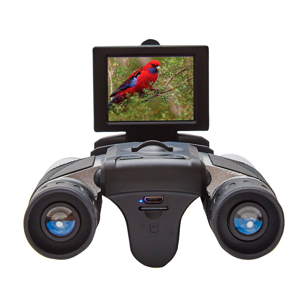 Optika binokulárního dalekohledu umožňuje pozorovat vzdálené objekty při 10x zvětšení; k dispozici je také digitální zoom až s 8x zvětšením. Inteligentní design s uzavřeným můstkem je doplněn výklopným 2palcovým LCD displejem, který vytváří vysoce kvalitní obraz tvořený snímačem CMOS. Zaostřovací kolečko umístěné v těle v blízkosti čoček objektivu umožňuje rychlé a snadné zaostření obou čoček objektivů. Můžete zaostřit na cíle v rozsahu 10–1000 m.