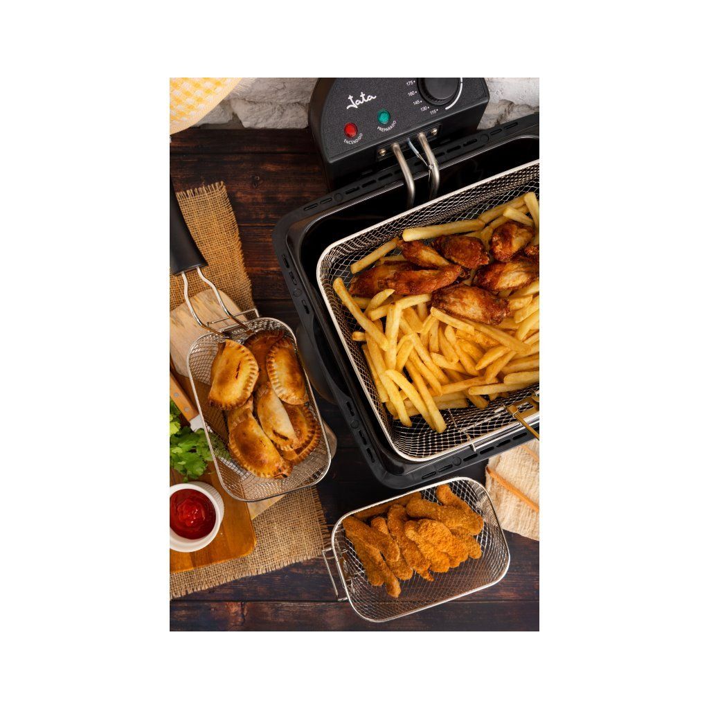 Fritéza Jata FR 700 je výkonné zařízení pro přípravu smažených pokrmů s příkonem 2000 W a kapacitou až 2,5 kg. Díky kompletně rozebiratelné nerezové konstrukci a ponořené spirále zajišťuje rovnoměrné smažení a snadnou údržbu. Ideální volba pro rodiny i náročnější uživatele, kteří oceňují praktičnost a kvalitní provedení.