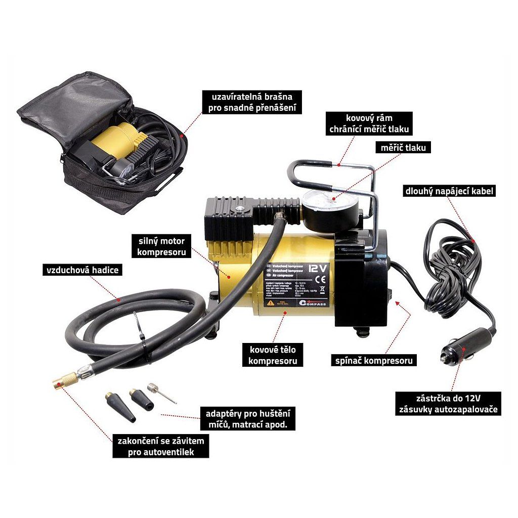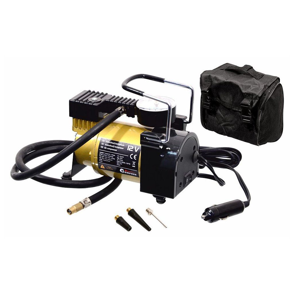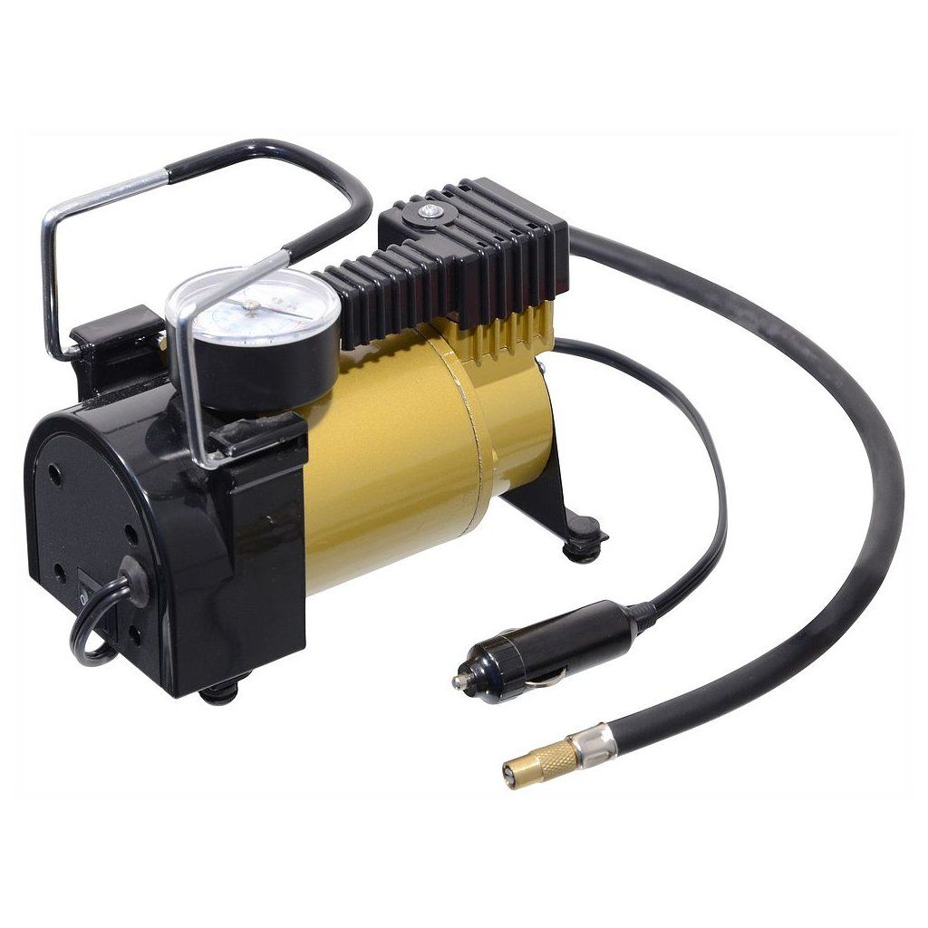 Vzduchový kompresor s měřičem tlaku, napájení 12V=. Napájecí kabel se zástrčkou do zásuvky automobilového zapalovače 12V. Kompresor je vhodný k huštění pneumatik osobních automobilů, dodávek i vozů 4x4. Kompresor vyvine max. tlak 9 kg/cm2 (BAR).