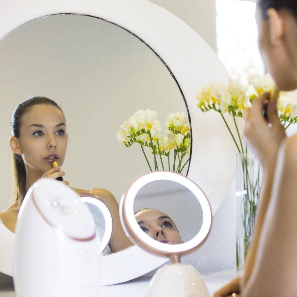 Bezdrátové Ultimate Glow Beauty zrcadlo je ideální pro použití bez ohledu na to, kde se právě nacházíte. Disponuje oboustranným zrcadlem - 5-násobně zvětšující a klasické, obě s LED podsvícením pro zlepšení viditelnosti. Zrcadlo má nastavitelný sklon dozadu i dopředu o 30 stupňů pro pohodlné používání během nanášení make-upu a péče o pleť. Nabíjí se pomocí kabelu USB a každé nabití vydrží až 8 hodin.