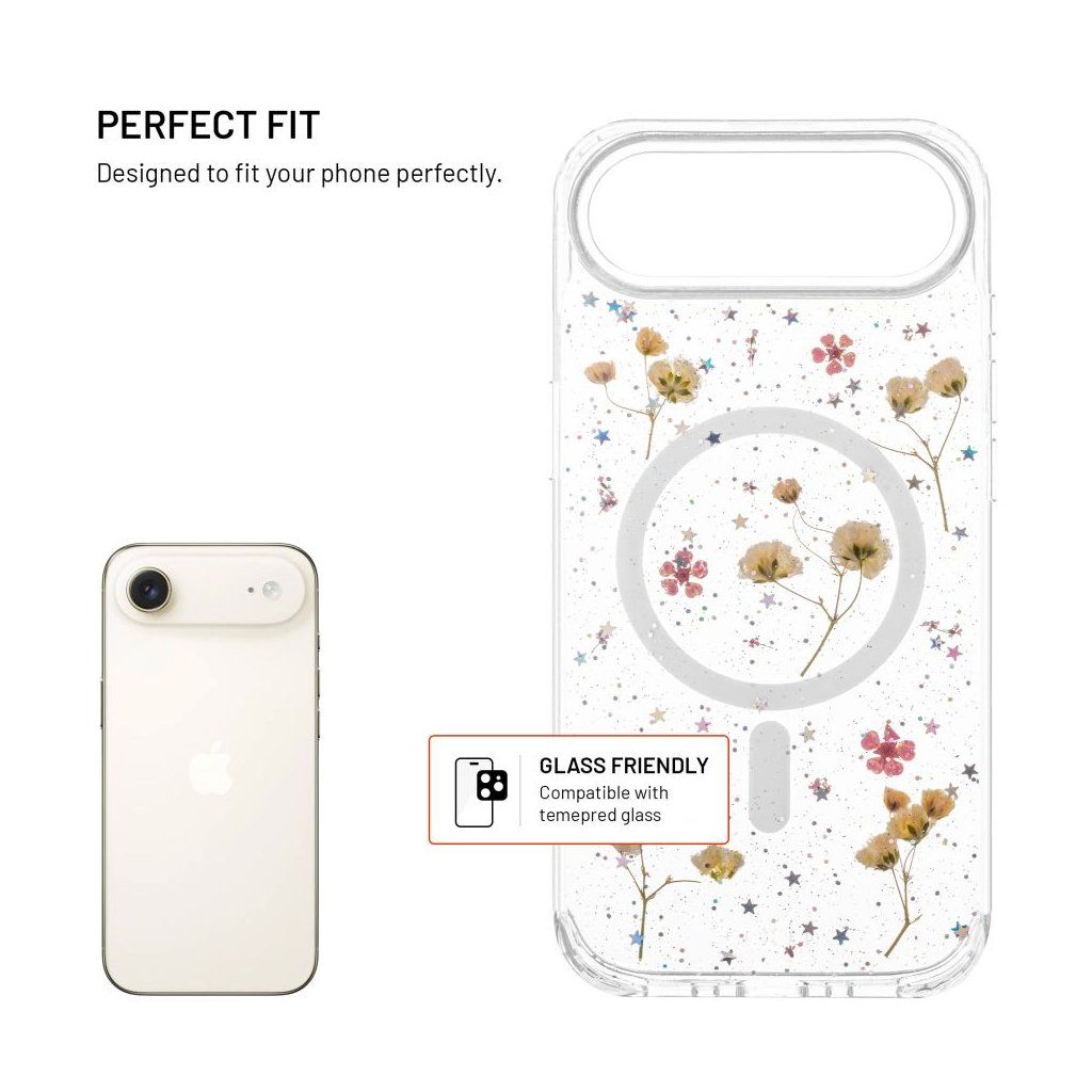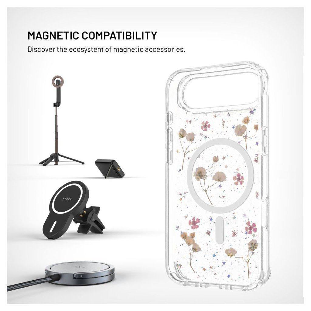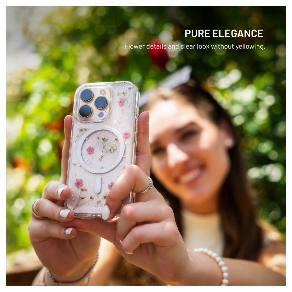 Ochranný kryt FIXED MagBloom promění váš telefon ve stylový a zároveň praktický doplněk, který poskytne spolehlivou ochranu při každodenním používání. Zadní strana z tvrzeného polykarbonátu chrání před poškrábáním, zatímco boky z pružného TPU tlumí nárazy a pády. Největší pozornost ale upoutá originální design – přímo do zadní strany jsou zalisovány pravé sušené květy, které si zachovávají svůj přirozený tvar i barvu. Díky tomu je každý kryt originál. Čirý materiál zároveň přirozeně odolává žloutnutí a lehce zvýšené hrany v oblasti fotoaparátu a displeje je chrání před kontaktem s povrchem a případným poškrábáním. MagSafe magnety jsou také zalisované přímo do těla krytu, aby nijak nevystupovaly a nehrozilo jejich vypadnutí. Spolehlivě se tak přichytí k nabíječkám i dalšímu magnetickému příslušenství. S každým kusem FIXED MagBloom získáte originální květinový vzhled spolu se spolehlivou celkovou ochranou.Vlastnosti: