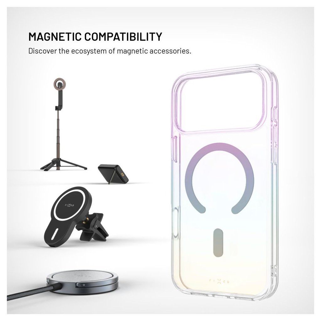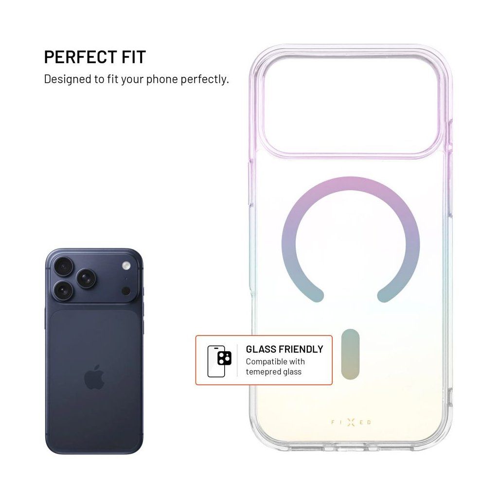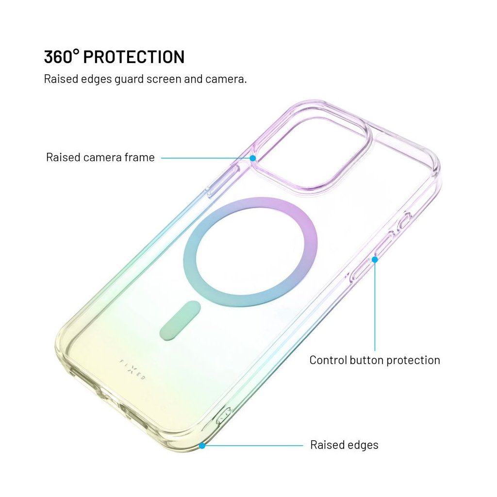 Ochranný kryt FIXED MagRainbow s podporou funkce MagSafe spolehlivě udrží váš telefon v bezpečí před všemi nástrahami všedního dne. Zadní strana z tvrzeného polykarbonátu chrání před poškrábáním, zatímco boky z pružného TPU tlumí nárazy a pády. Design krytu doplňuje jemný duhový efekt, který z každého telefonu okamžitě udělá stylový doplněk. Použitý materiál přirozeně odolává zažloutnutí a lehce zvýšené hrany v oblasti fotoaparátu a displeje je chrání před kontaktem s povrchem a případným poškrábáním. Kryt je doplněn o integrované MagSafe magnety, které se přesně a stabilně uchytí k nabíječkám a dalšímu MagSafe příslušenství. Kryt FIXED MagRainbow spojuje praktickou ochranu s jednoduchým designem, který telefonu dodá styl.Vlastnosti: