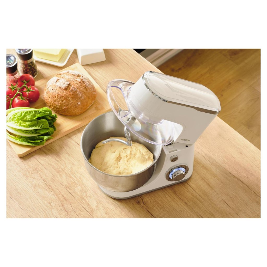 Sencor STM 3630WH je spolehlivý a výkonný kuchyňský robot, který usnadní každodenní přípravu pokrmů. Díky motoru s výkonem 1300 W zvládne nejen běžné míchání a šlehání, ale i hnětení hutných těst, například na chléb nebo pizzu. Velká nerezová mísa o objemu 5,5 litru umožňuje zpracovat až 2,7 litru těsta najednou, což oceníte při pečení pro celou rodinu. Planetární systém míchání zaručuje, že všechny suroviny budou dokonale promíchané bez zbytků na stěnách nádoby. Ovládání je jednoduché a intuitivní, s možností volby ze šesti rychlostí a funkcí PULSE pro krátkodobé zvýšení výkonu.