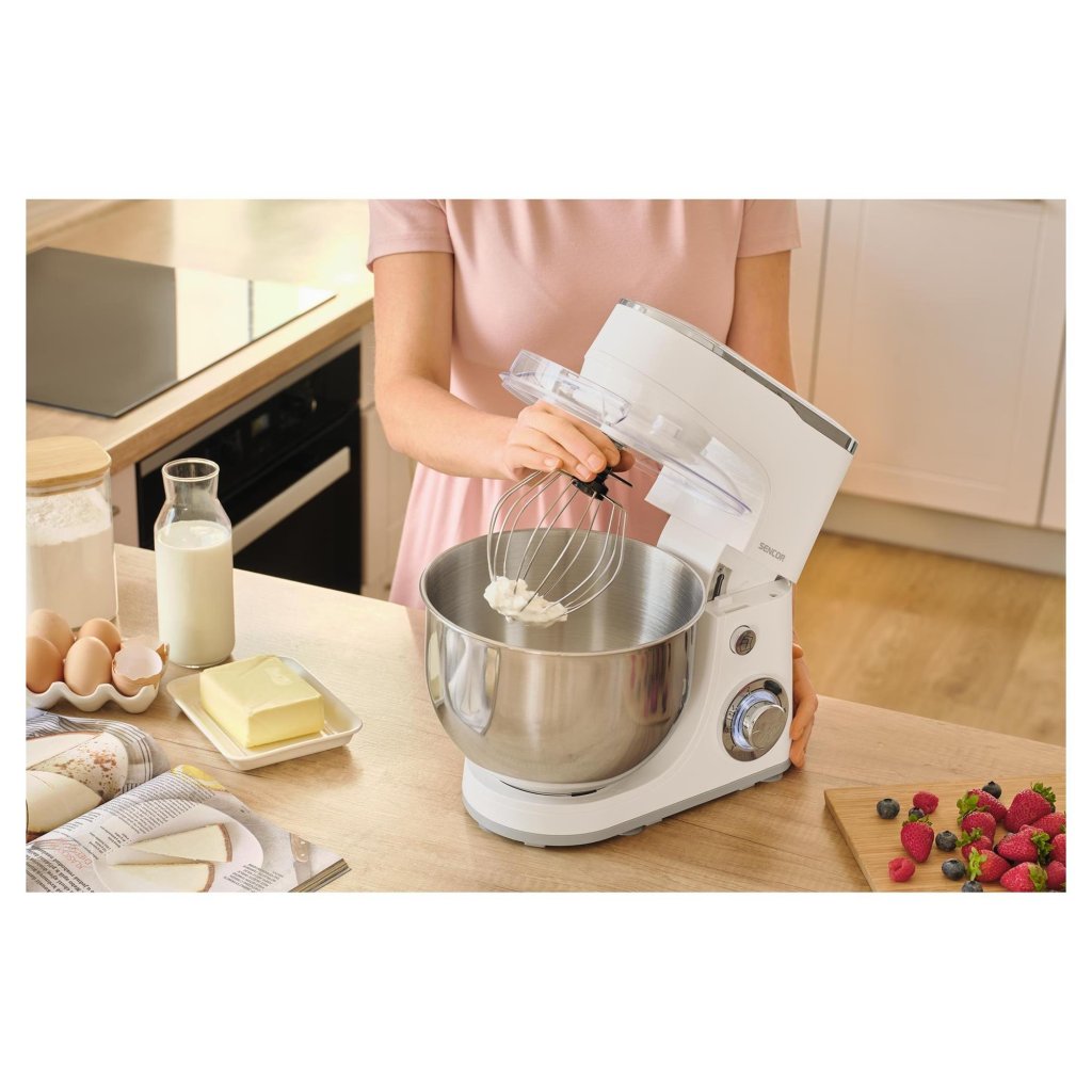 Robot je navržen s důrazem na praktičnost a snadnou údržbu. Příslušenství ze slitiny hliníku je odolné a snadno se čistí, zatímco nerezová mísa je doplněna průhledným krytem s plnicím otvorem, který zabraňuje nechtěnému rozstřiku surovin. Díky stabilní konstrukci a protiskluzovým nožkám zůstává robot pevně na místě i při maximálním výkonu. Sencor STM 3630WH je ideální volbou pro každého, kdo hledá spolehlivého pomocníka pro míchání, šlehání i hnětení.